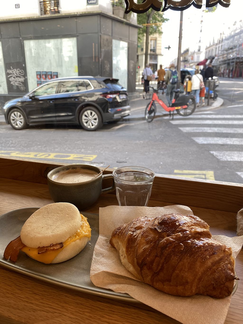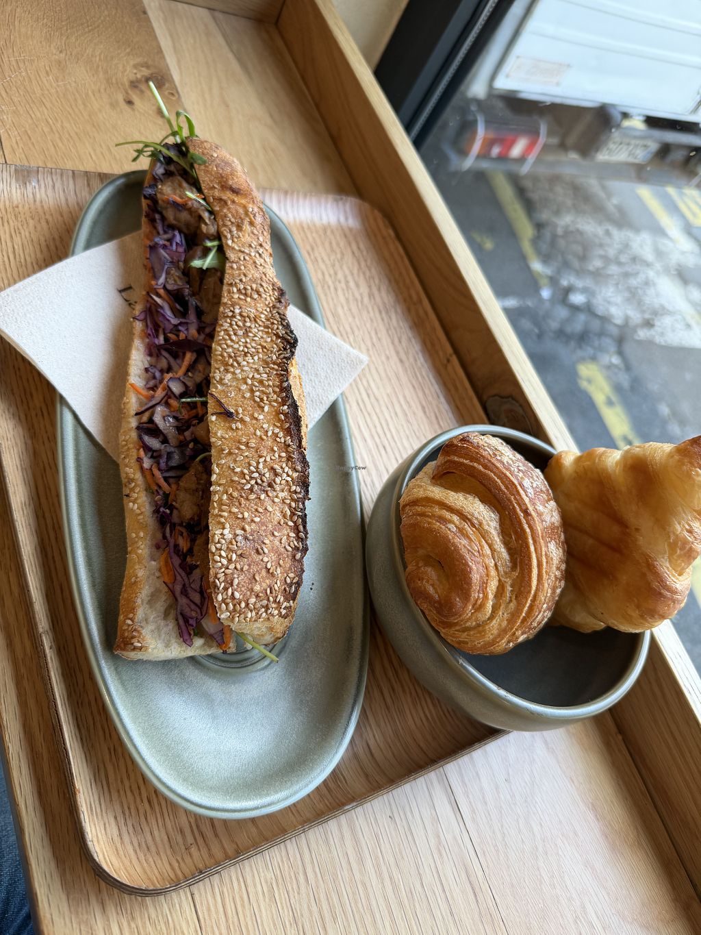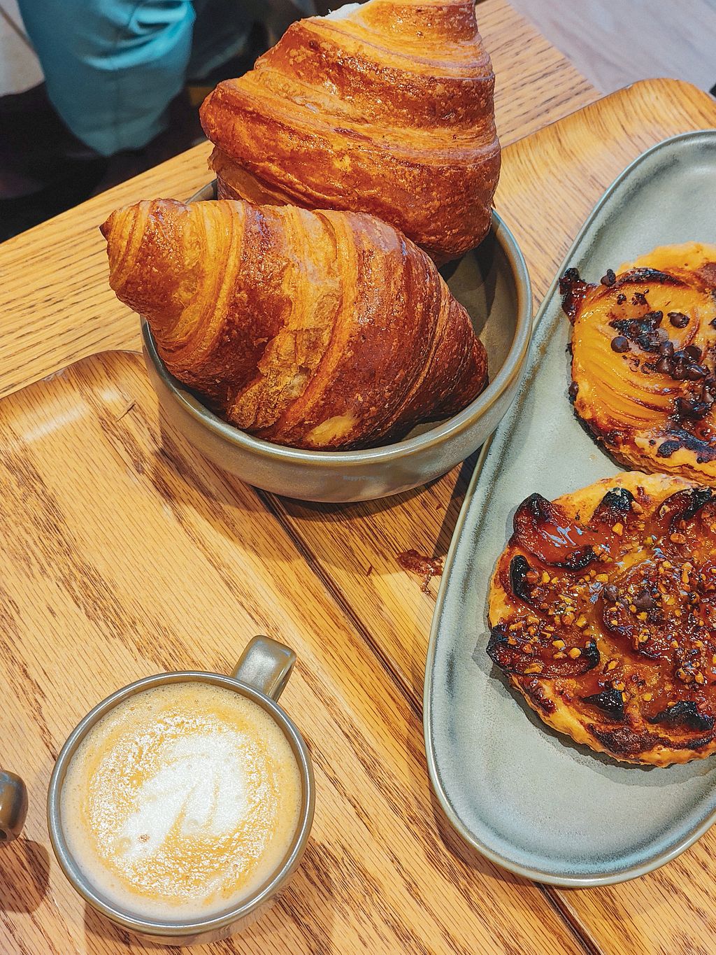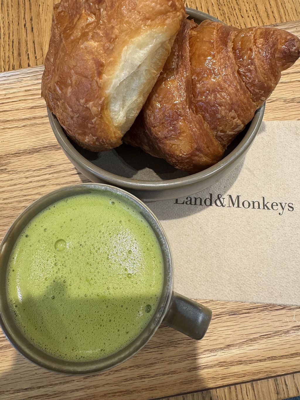Matcha latte with a croissant and pain chocolat