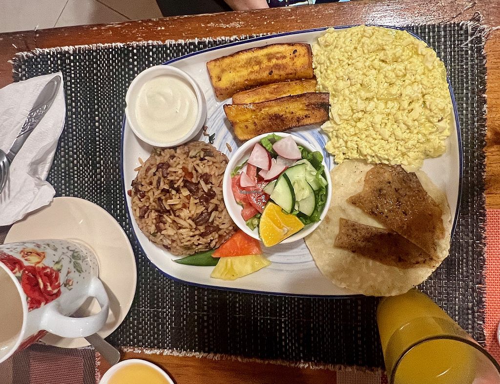 Hotel, vegetarian restaurant, and adventure center located in an isolated area at the end of a long road in the rainforest off Hwy 702. Menu offers items like falafel sandwich, pad thai tofu, pasta with tomato sauce, and a comida typico with rice, beans, fried plantains, vegetarian chorizo. Vegetables are supplied from onsite organic nursery. Reported fully vegan November 2022. Open Mon-Sun 7:30am-8:30pm.