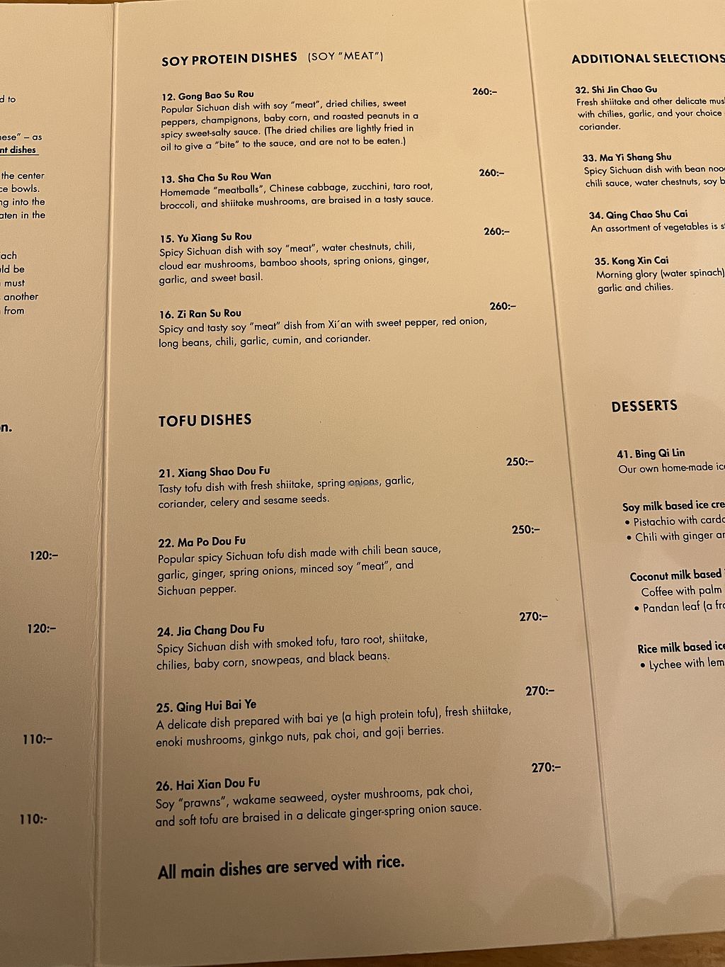 We didn’t make a reservation so were very lucky to snag a walk in table on a busy Saturday night (the place filled up very quickly after we sat down so I’d highly recommend reserving). We were spoiled for choice with the menu, eventually deciding on a smoked tofu & blackbean dish and mixed vegetables in a garlic sauce. All main dishes come with rice included. The smoked tofu was tasty without being overpowering and the sauce was the perfect mix of sweet and spicy. The mixed veg dish was super fresh with a decent variety of vegetables. For dessert we tried some pistachio ice cream with cardamom, coffee & a sorbet. The coffee flavour was perfection. Decent selection of wine - I was pleased to see a Riesling (my favourite). Service was very friendly and efficient without being overbearing. It was expensive but overall worth it in my opinion. Wouldn’t hesitate to return!