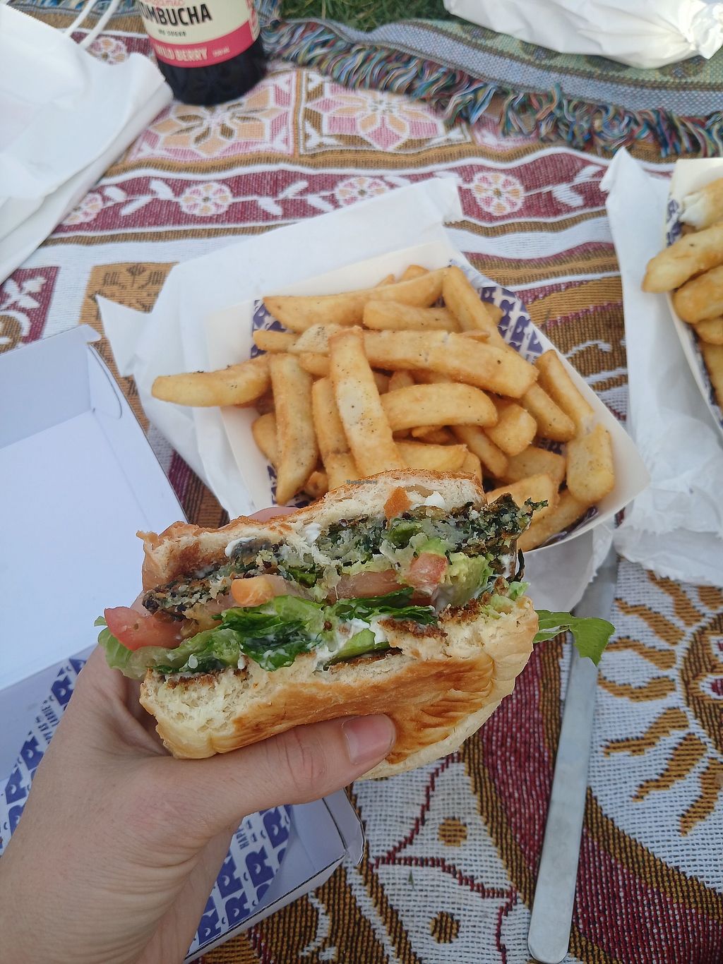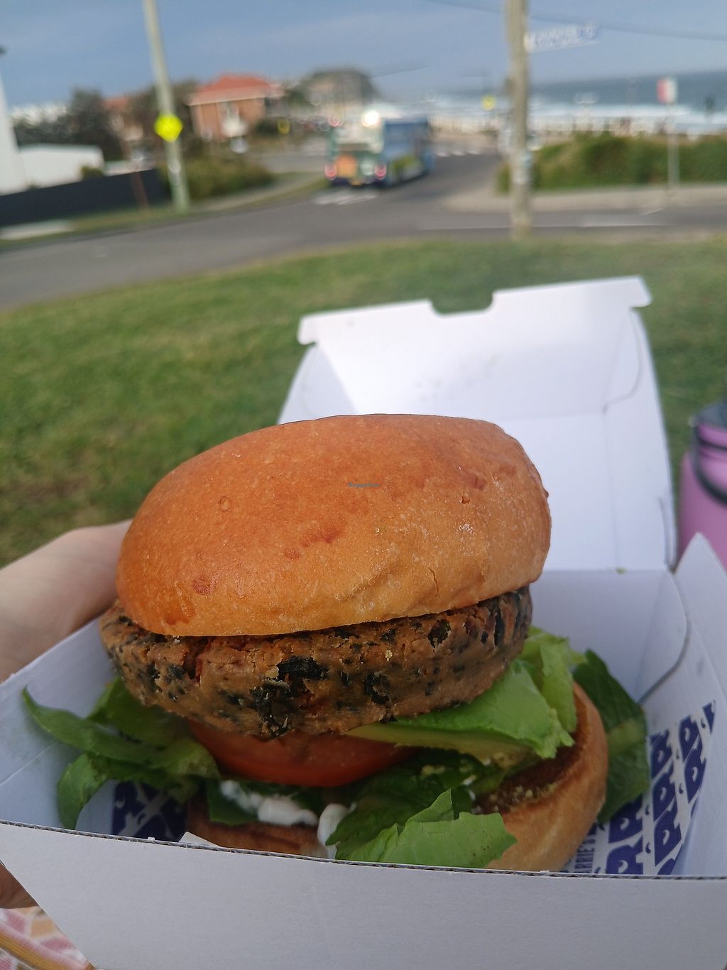 Serves meat, vegan options available. Takeaway restaurant with clearly labeled menu. Example vegan offerings include quinoa salad, vegan burger and pineapple fritters. Open Mon-Fri 11:00am-8:00pm, Sat-Sun 10:00am-8:00pm.