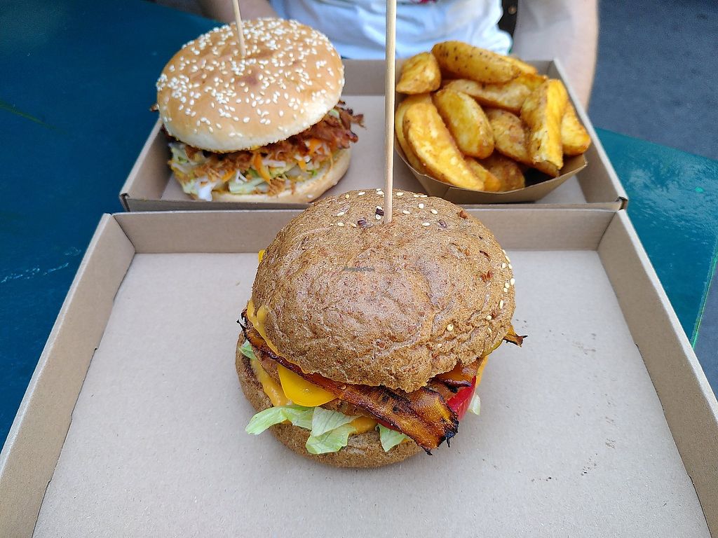 Two burgers- Pull Pork and Carrot. Nuggets, sweet potato fries and reg…