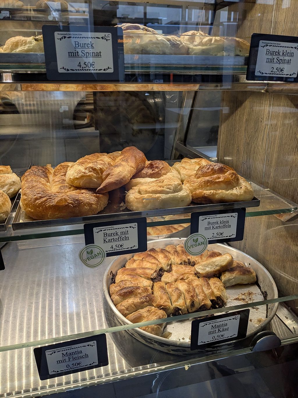 Eastern European style bakery offering vegan baked goods such as burek with potato filling, 'butter' croissants (plain or filled with pistachio creme or jam), cinnamon rolls, strudel, danishes with various fillings, and different types of breads. Open Mon 07:00-20:00, Tue-Sun 06:00-20:00.