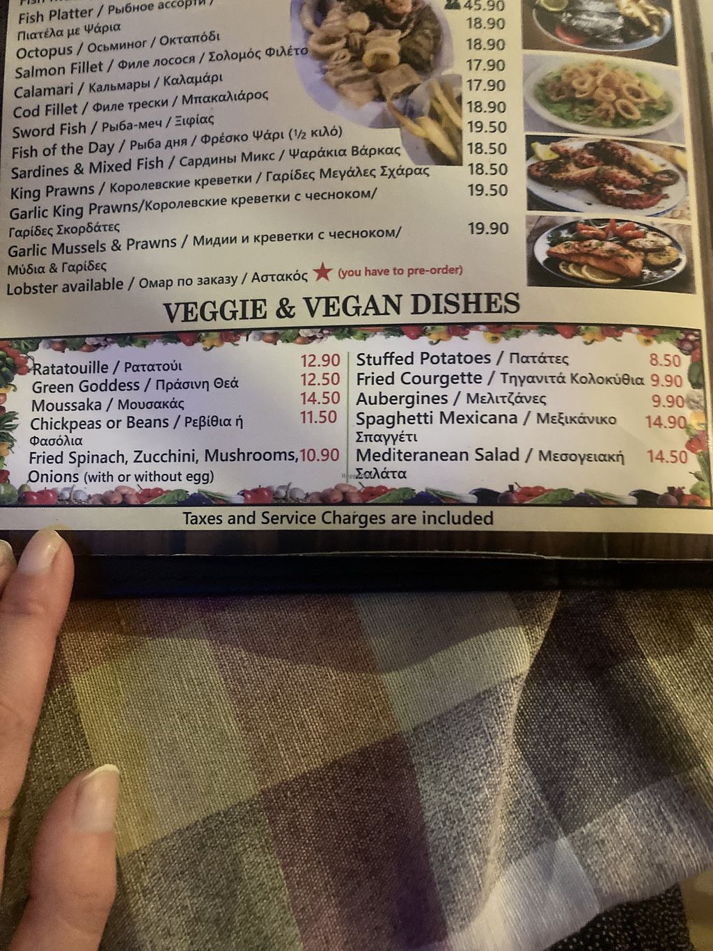 We were greeted by 2 lovely ladies who said that providing vegan options was no trouble. Once seated we met the owner who told us he would cook us a vegan meal, he went through all the options which sounded so delicious we said yes to them all. We were not disappointed, a spinach dish which he told us his grandma used to cook as she didn't eat meat, a Greek salad (No feta) and a garlic grilled vegetable medley, rice , chips, olives & bread. Clearly a chef who understands how to produce a fantastic vegan meal without being fazed.Very respectful and friendly