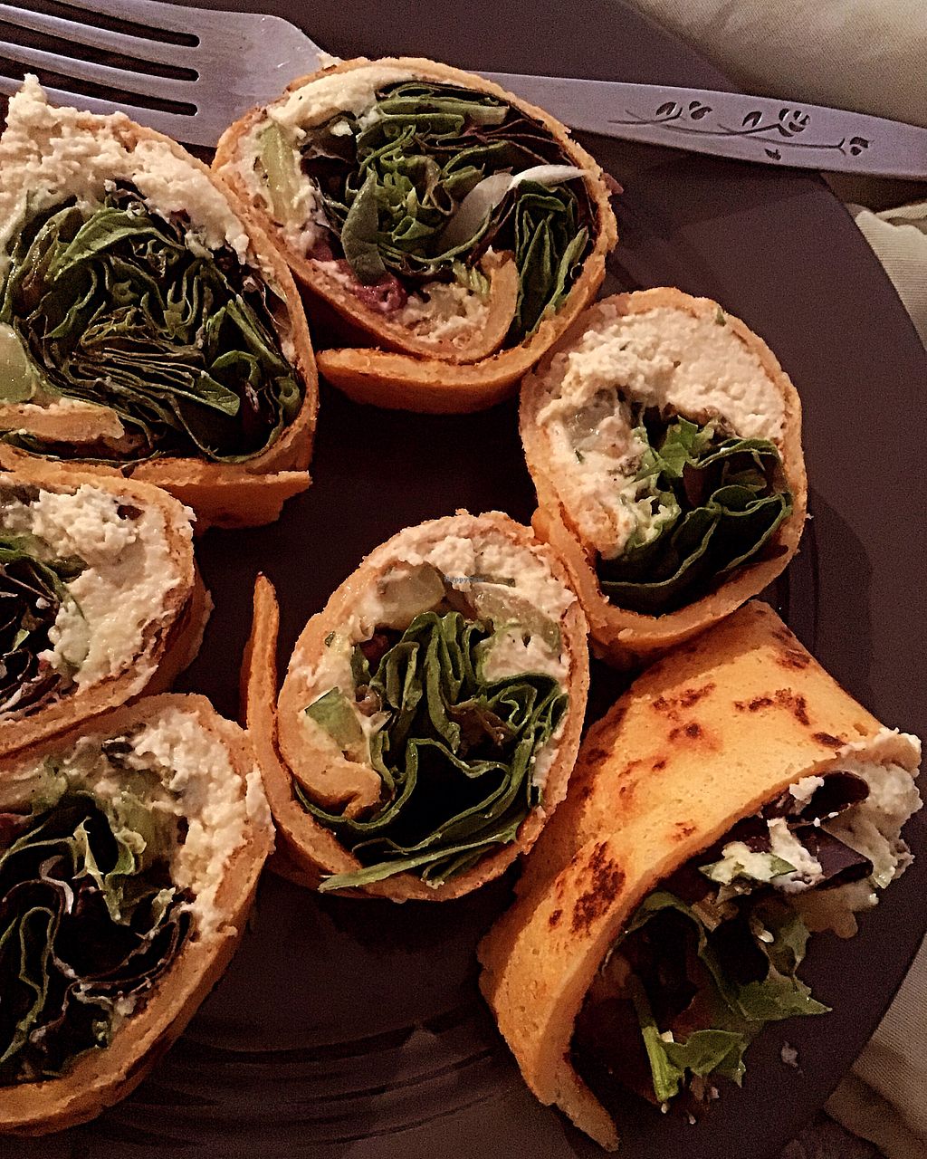 Hummus roll up served in a homemade red lentil wrap