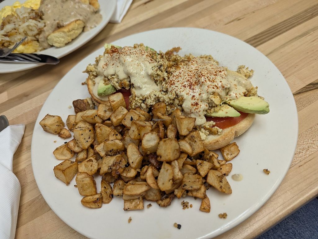 Vegan Biscuits & Gravy with potatoes & tofu scramble (all very good!) …