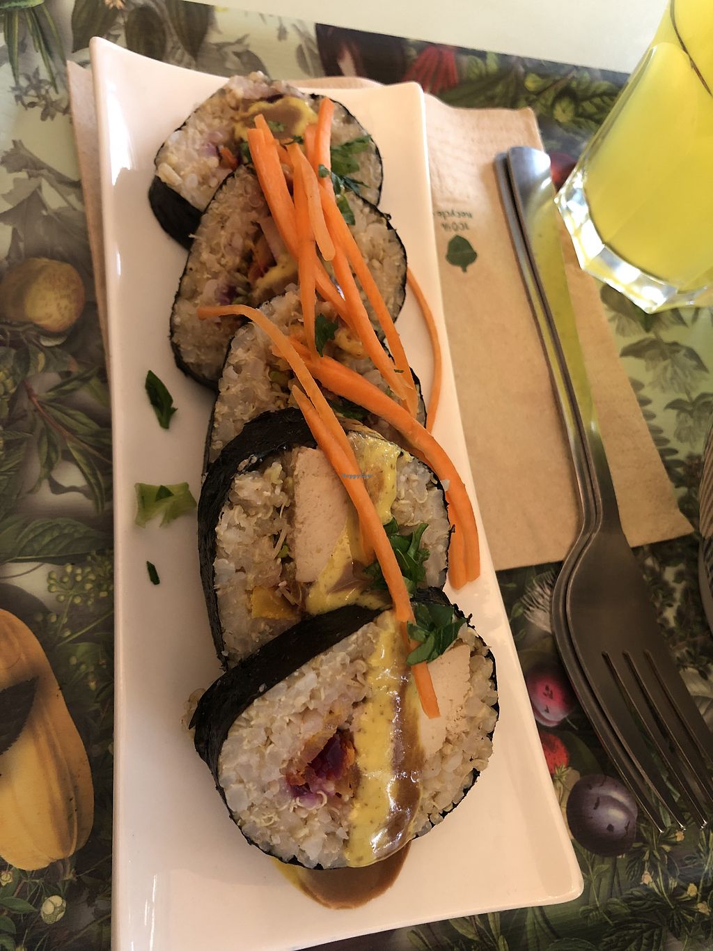 Tibetan Mama, Veggie Sushi Roll, et ice tea fais maison.