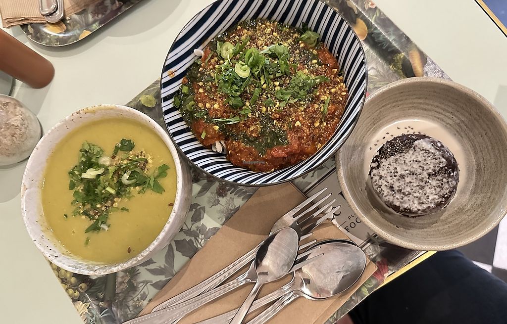 Zucchini soup, bolognese, brownie