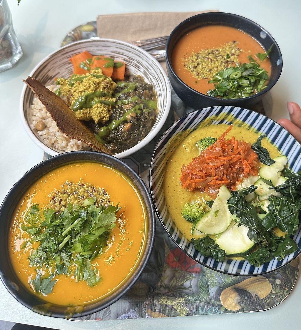 2 Botanical Menus: (clockwise from right) Carrot soup, Tibetan Mama, g…