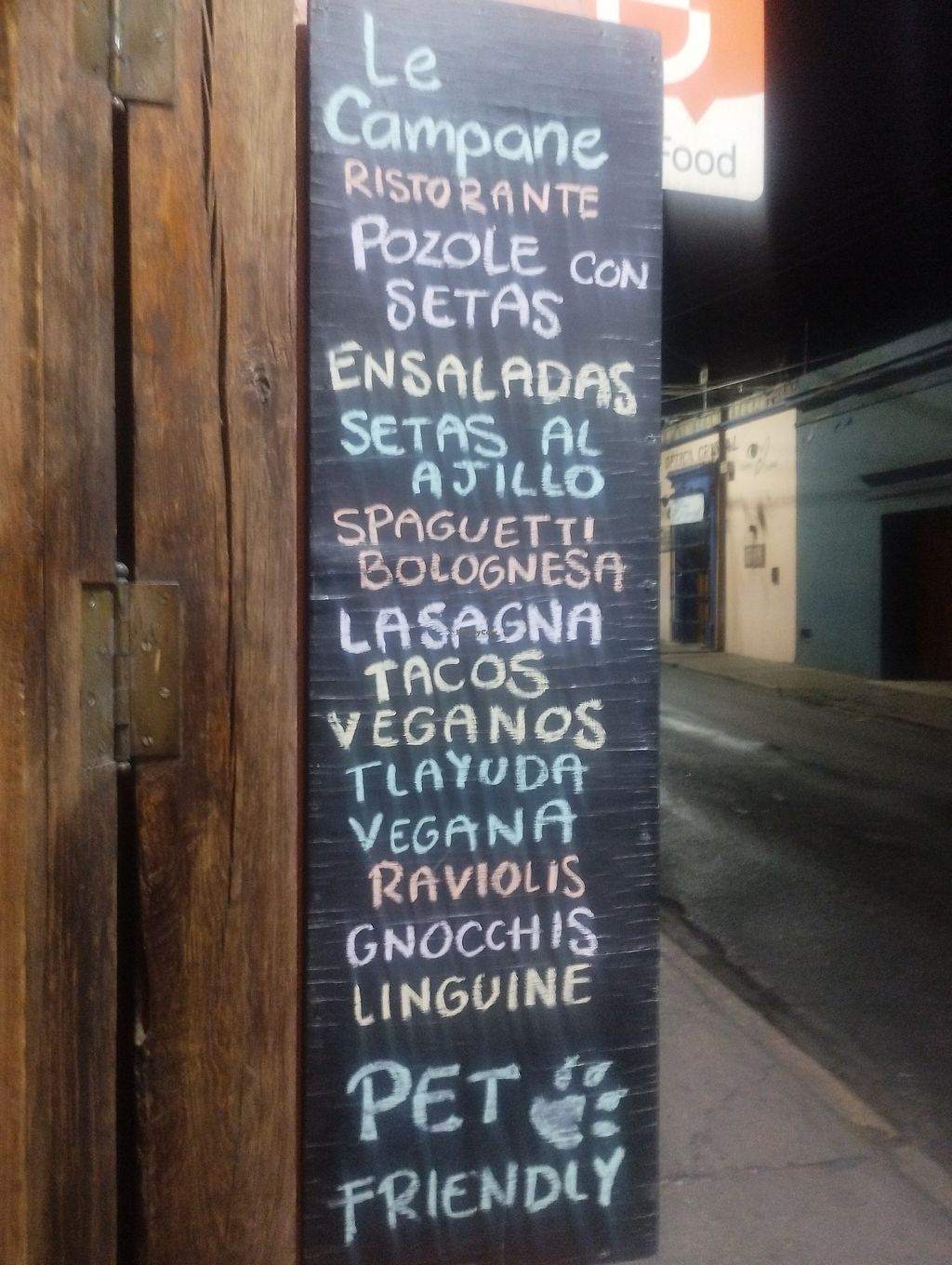We had a hard time finding vegan food in Oaxaca. Le Campane offers vegan Soups, Salads, Tacos (with Soyameat) and a very nice Burger! There was no one in the the Restaurant but we (in december). Staff was okay. Place is cool! Would definitely visit again.