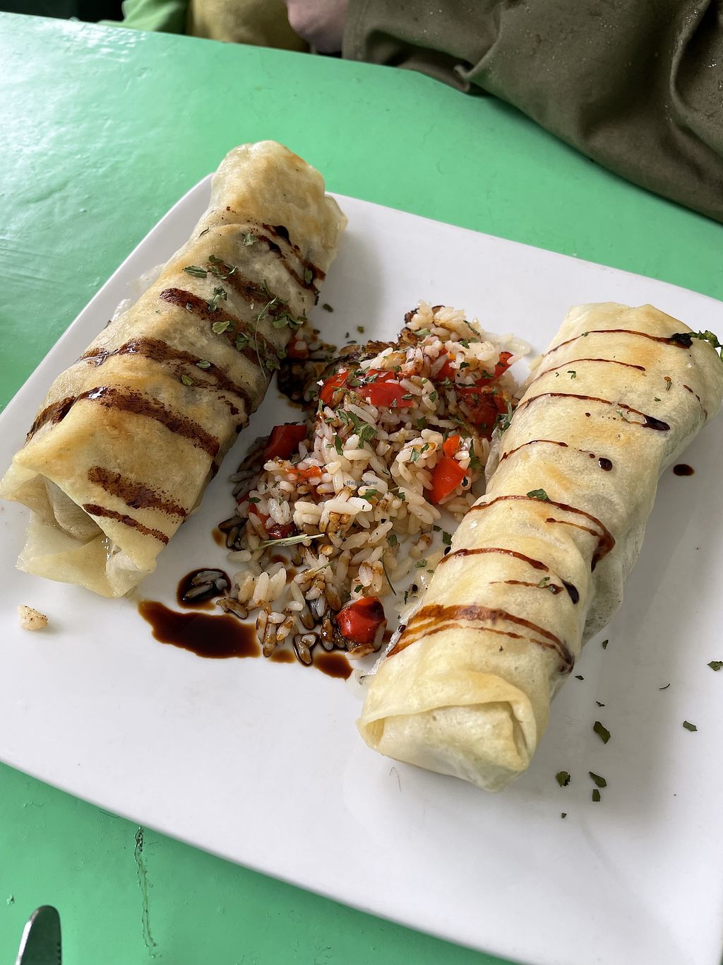 French speaking server. The tajines here only had the ingredients listed with more spices and herbs. The bean and courgette I preferred to the artichoke and pea. The mint tea was more a mix of fresh and dried. I prefer fresh mint tea. We got the pastilla and spring rolls next as my partner was still hungry. Several things we requested for the menu they didn’t have so we went with his recommendation. The mixed pastilla was probably my favorite with lots of veg and balsamic drizzled over and rice with red pepper. We far prefer Shyadma’s vegan food next door but this was a savior when it was closed.