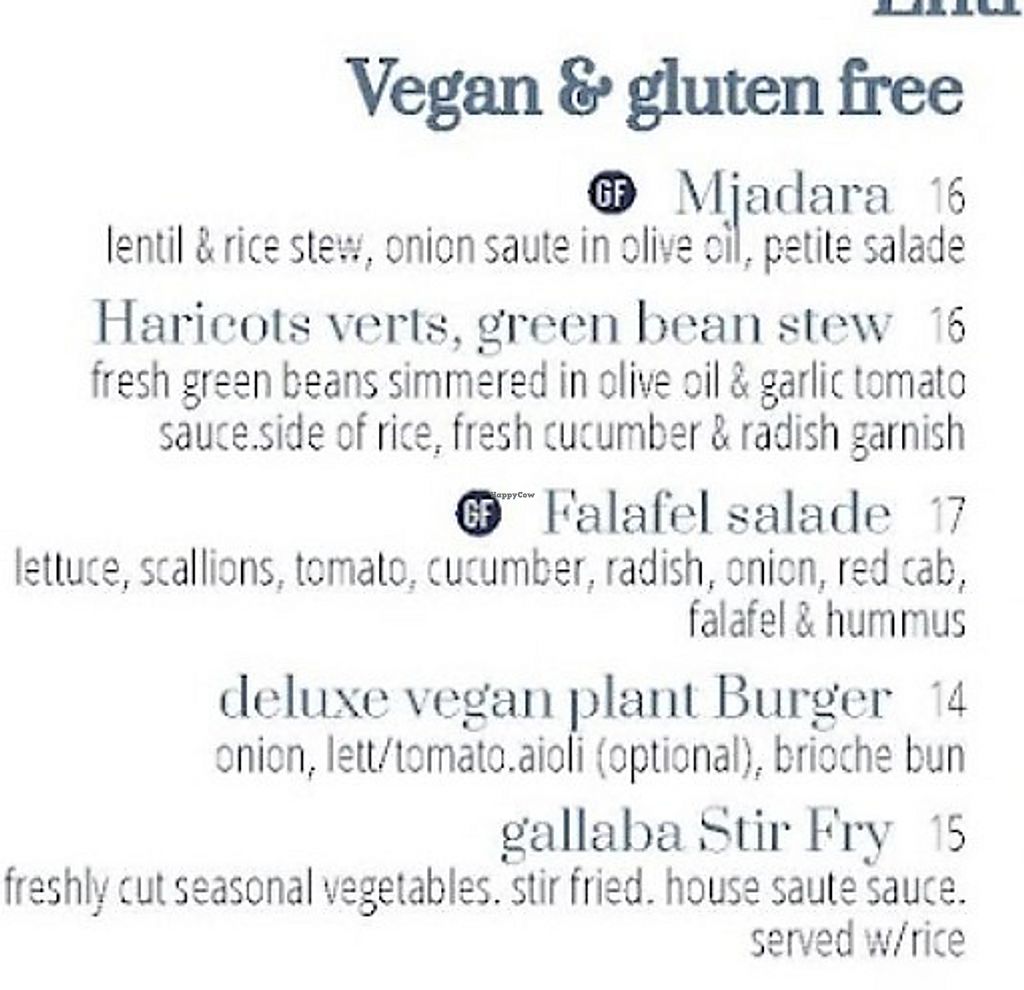 Serves meat, vegan options available. Euro-Mediterranean restaurant with plenty of vegetarian choices and a few vegan ones like tomato kibbe, hummus, fries, m'jadra (omit yogurt), falafel, grape leaves. Open Tue-Thu 5:00pm-10:00pm, Fri-Sat 5:00pm-11:00pm.
