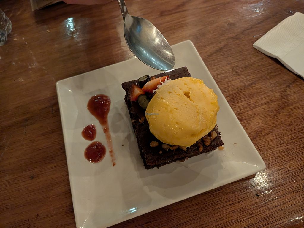 The place itself is really cute, it has a nice garden and good atmosphere. The staff was friendly as well, but unfortunately the food was just a bit disappointing. The lasagne was quite good but cold and the curry was way too salty and lacked other flavours. The portions were also not really big so we ordered some desserts. The "snickers" was just a tiny dry date bar (some store bought ones are way better) and the brownie with ice cream was probably the best of all the things we ate.