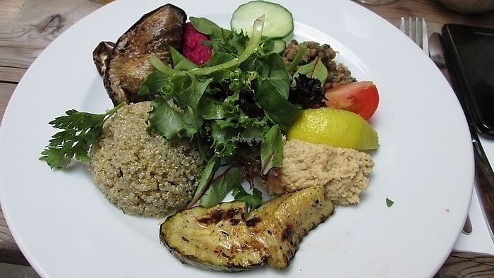 Plate of hummus, lentils, grilled eggplant, salad, quinoa and beetroot…