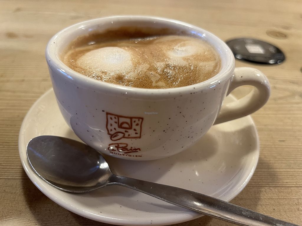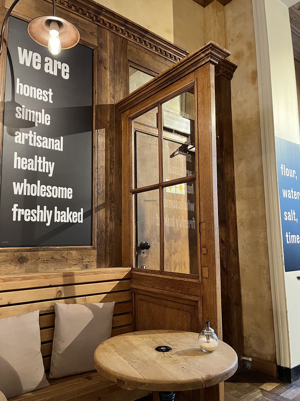 Serves meat, vegan options available. International restaurant chain featuring artisan bakery and communal table. Menu includes ovo-lacto vegetarian dishes as well as vegan ones (denoted). Open Mon-Sun 08:00-18:00.