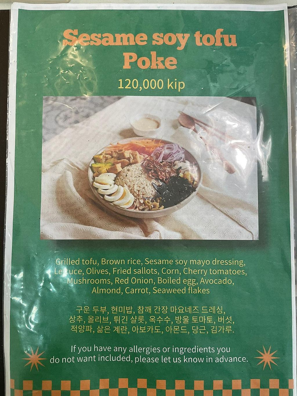 Sometimes you need a really good salad to reset your body. This Sesame Soy Tofu poke bowl here is that kind of salad. To make it vegan (see photos below), just add them not to include the boiled chicken egg. Not only is the mix of veggies healthy in this poke bowl, but however they did it, the tofu is really moist and the generous amount of dressing they provide is really tasty.