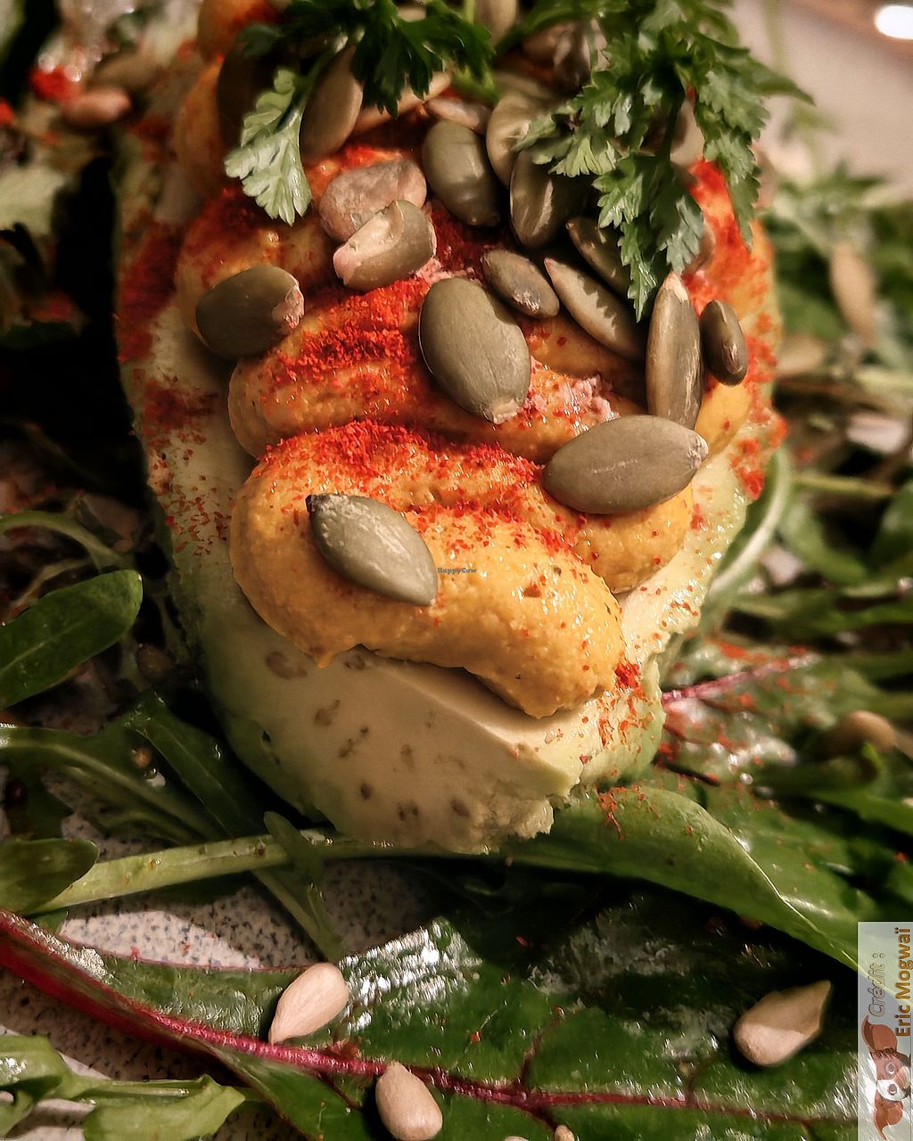 Hard-boiled avocado Turmeric hummus, microgreens, Kala namak salt
