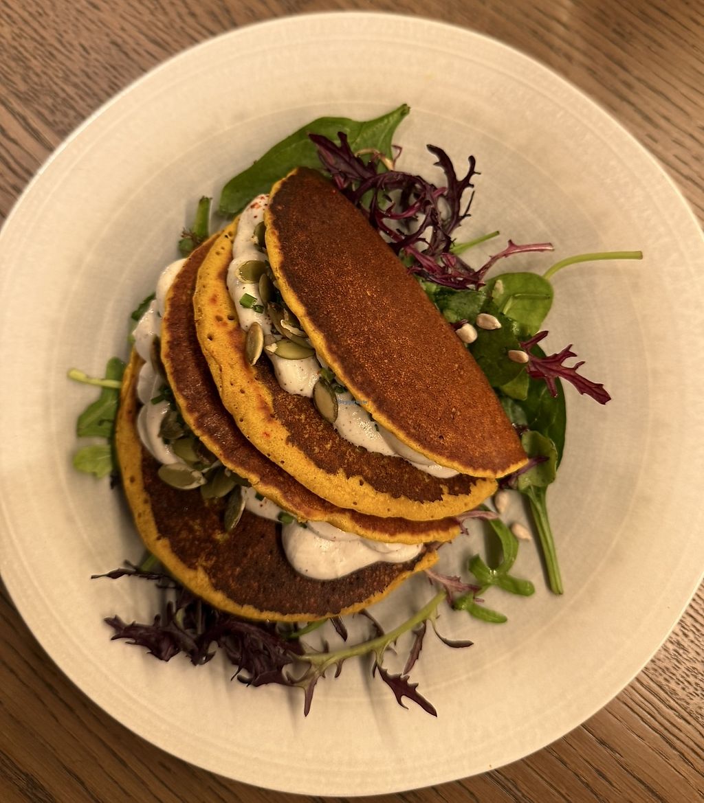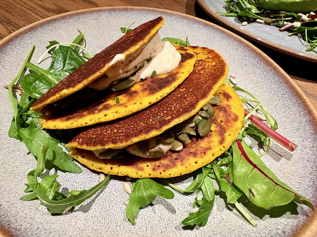 Went for a Sunday brunch but ordered off the menu. Starter was a grilled romaine which was beyond delicious. Main was a green lentil and shiitake bowl-mouth watering good. And to end such a fantastic meal, almond and rice pancakes. This was a noteworthy meal. Really sweet place and great staff also with English menus.
