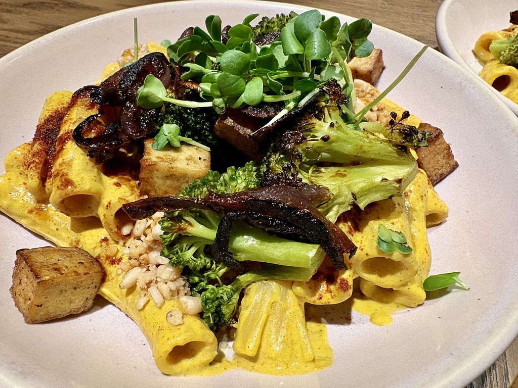 But now to the food: highly recommend the sesame tofu which was the highlight of our meal (starter). Feeling more ambivalent about the mains: the rigatoni, although flavorful, did not ignite the fireworks that we had anticipated. The riz Camargue looked like a stroll through a summer garden, with its lush garnish and beautiful colors, but lacked some counter-flavor to its light summery notes. We‘d recommend replacing the corn with more celery bites or capers/olives and maybe some sun-dried tomatoes.
