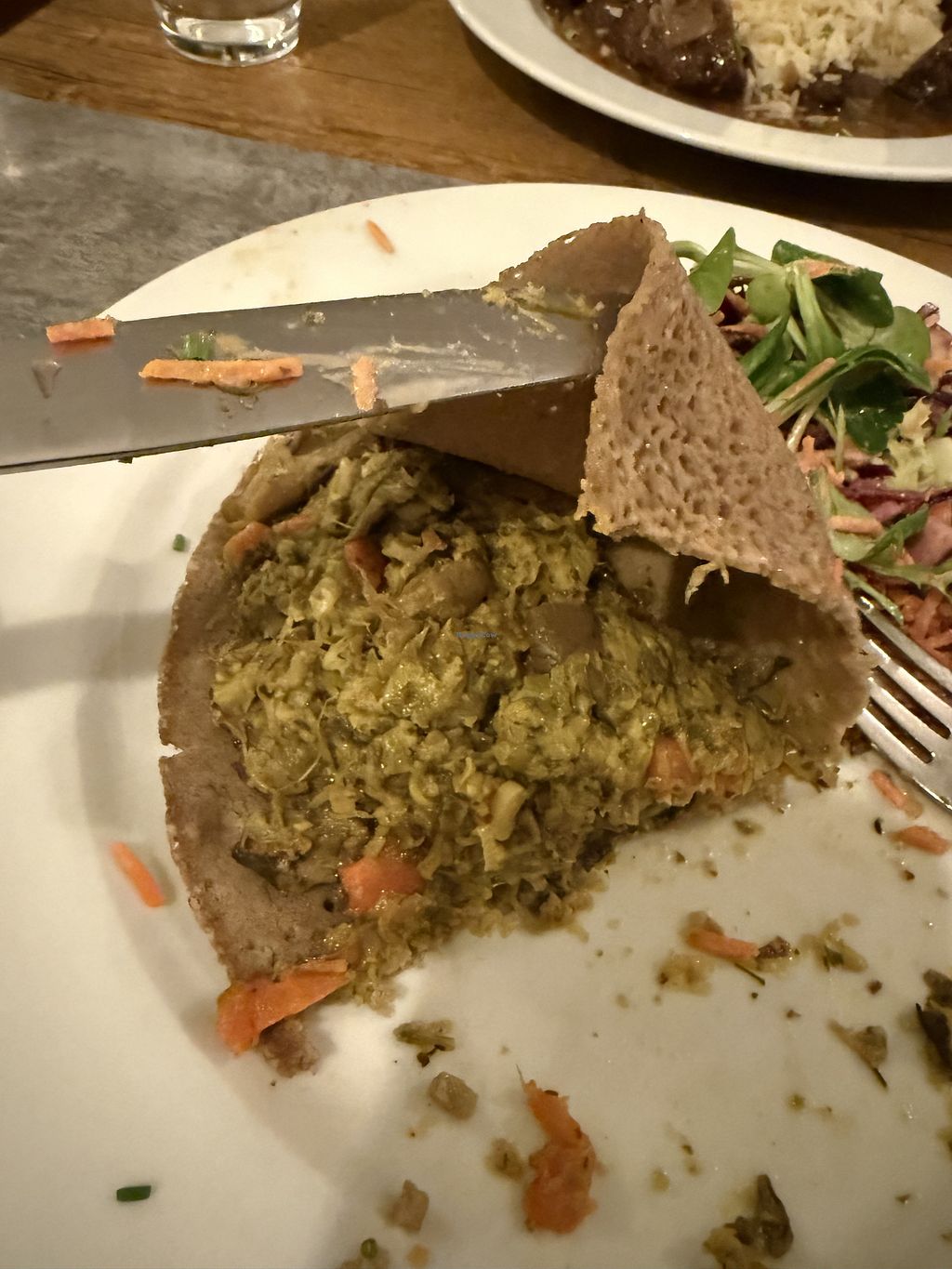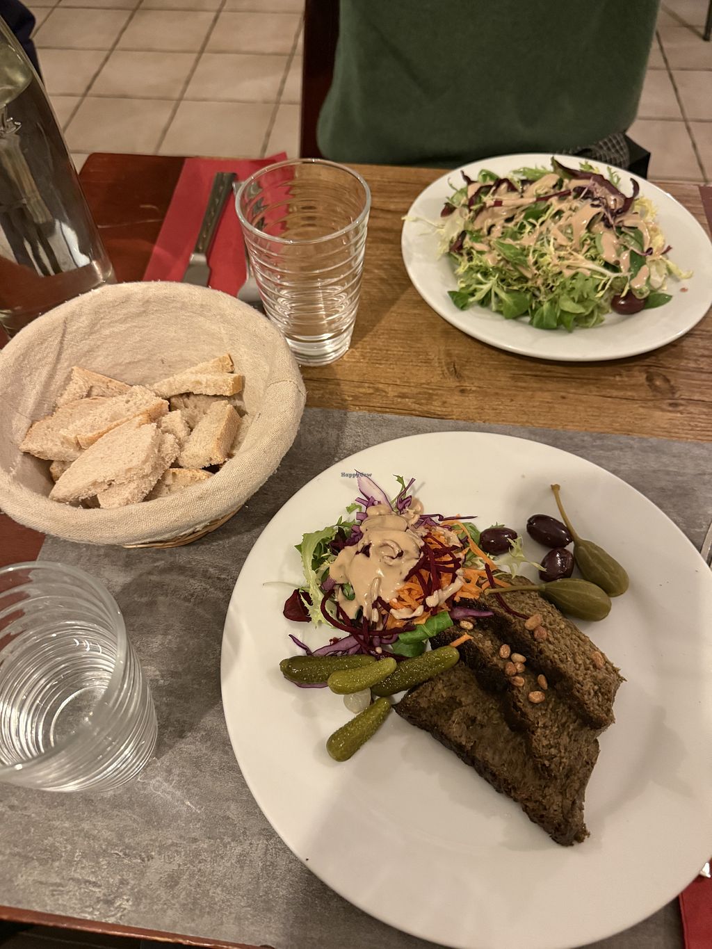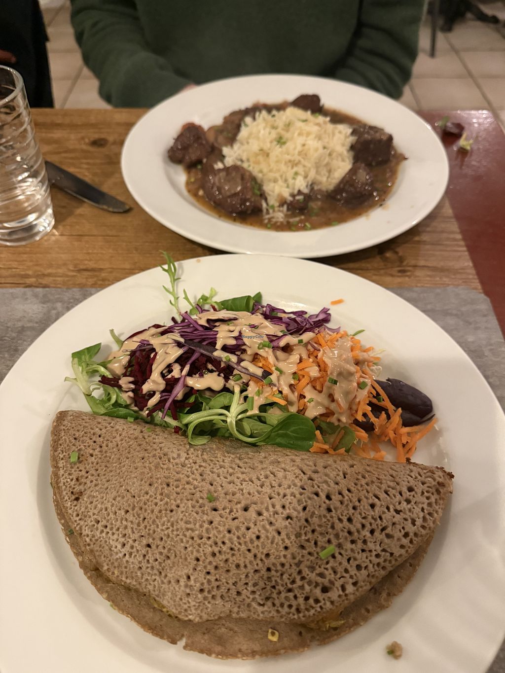 I really wanted to like this one! I saved up for one fancy meal on my last night in Europe and of course chose a fully vegan restaurant. Unfortunately, I found the food quite bland. The Mushroom Pate was pretty good, but there was not nearly enough bread for the amount of pate. It was served with a (very mustardy) salad which wasn’t too bad. My friend got the seitan bourguignon that tasted fine, but had a very soft, spongey texture (not pleasant for my meat-eating friend). However, I got a savory crepe dish that genuinely had no flavor! It was served with the same salad as the pate which was too bad, because the other options seemed to come with some rice or potatoes. I asked for an extra side of potatoes but it was never brought out (this was an option on the menu, but I guess they forgot). The texture of the crepe filling was also a bit mushy which would have been fine if the taste was okay, but it made a disappointing meal. However, I wouldn’t have left a review at this point because I want to support vegan businesses. The real shocker is that both my friend and I felt an odd “crunch” while eating. I got 3 of these before I stopped eating entirely. It didn’t taste like anything (definitely not rock salt or pepper) but felt like I had bit into a small rock or large grains of sand, which hurt my teeth a bit. My suspicion is that the vegetables were not thoroughly washed and there was grit from the dirt, which I would like to not be fussy about but I hate to think I could have damaged my teeth. I never do this, but I tried to let the waiter know so that the chefs would check things out before serving other customers. The server was very dismissive and while he seemed nice, he tried to tell me there’s no way this could have happened. Very disappointing! I feel bad that I spent a good chunk of money on such a sad meal and had my concerns totally dismissed.