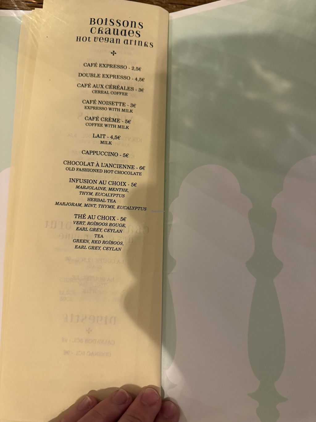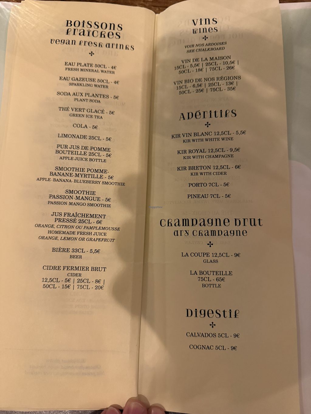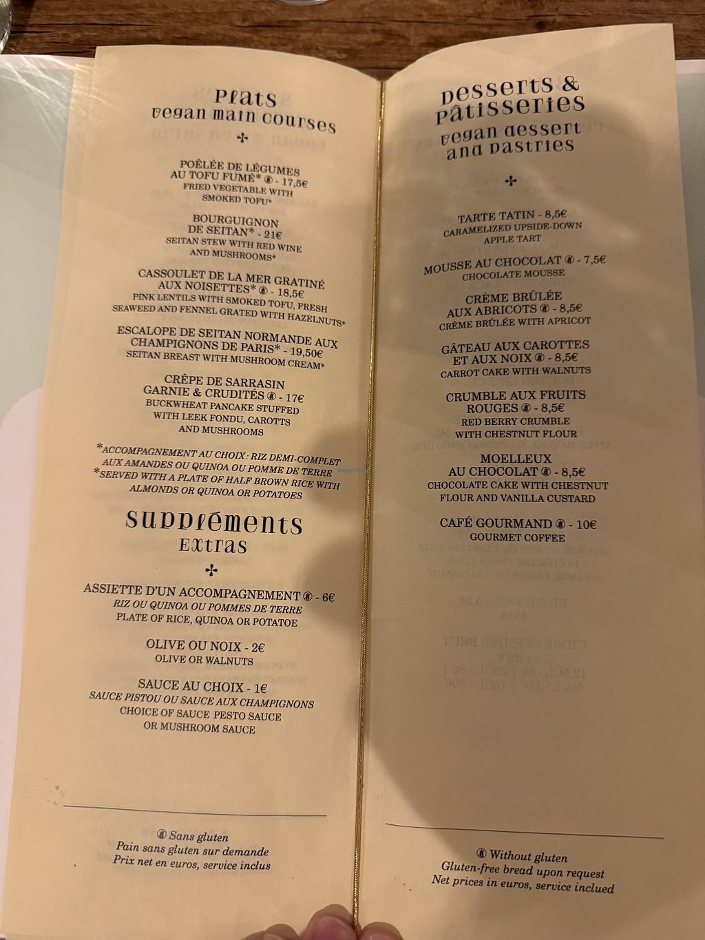 Restaurant has no animal products whatsoever. Everything is vegan. We had an amazing Seitan Rôtis with truffle cream, the entrée was une assiette de tartinades à partager (a plate full of different spreads, enough for at least 2 people) and as Dessert we had creme brûlée (which was good) and a moelleux de chocolate (like a very moist, dense chocolate cake, it was incredible).