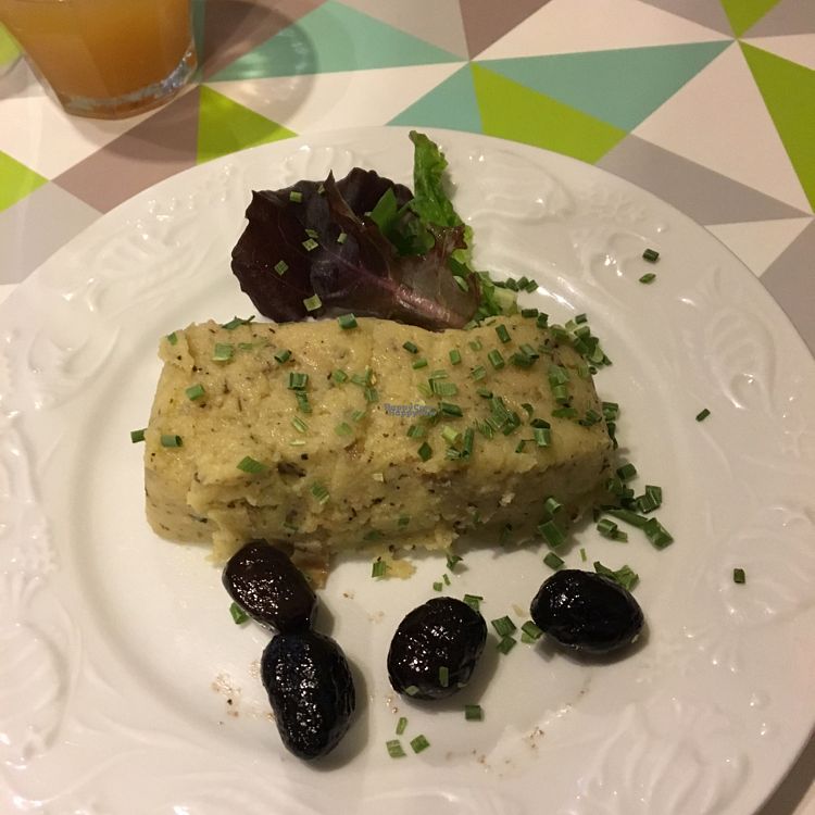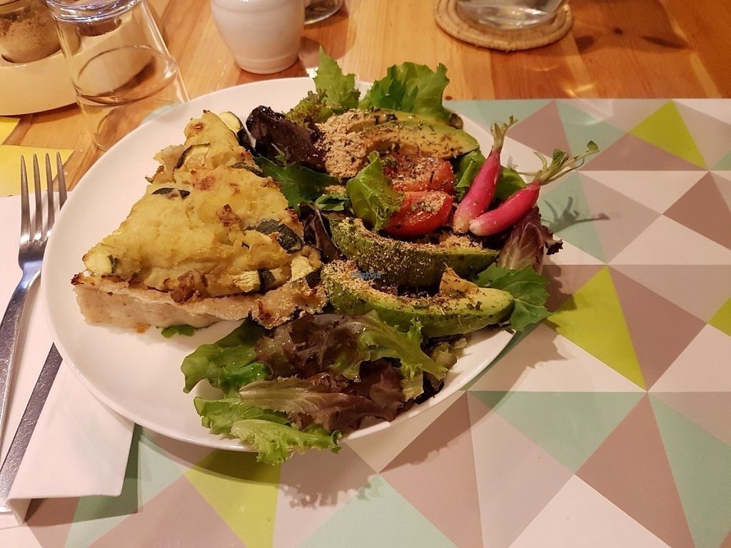 Potato leek pie w side salad. Recommended. Large portions and olives a…