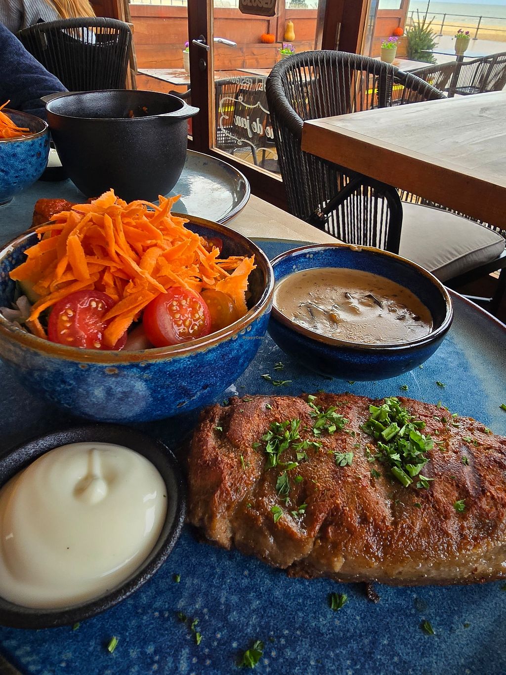 Seitan steak with mushroom sauce and greens