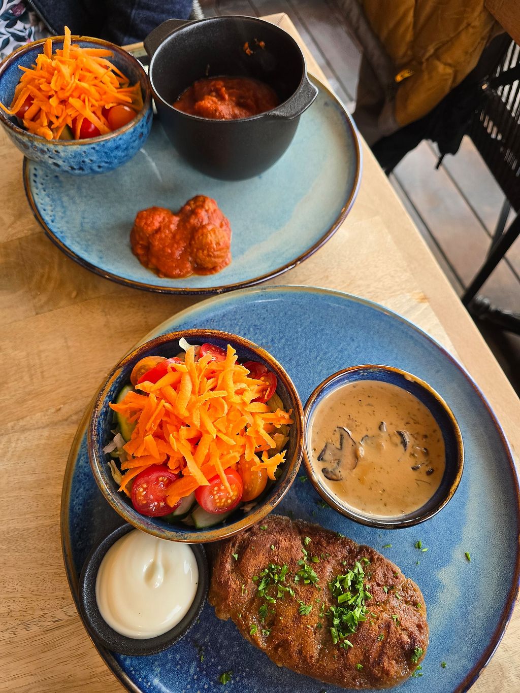 Balls in tomato sauce and seitan steak