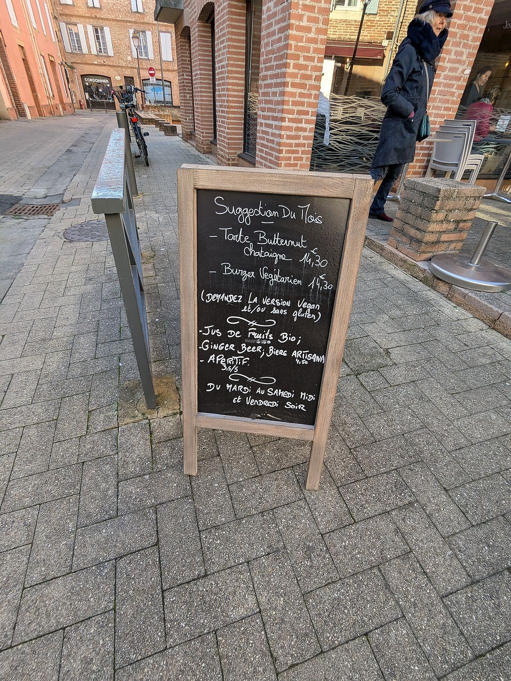 My family had an excellent meal here while passing through Albi. I recommend the Tournesol plate, with its delicious corn fritters. My daughters loved their veggie burger and falafel/hummus plates. Husband said Mexican plate was filling but a bit bland. Don’t miss the desserts- they were all fabulous! Friendly service, too.