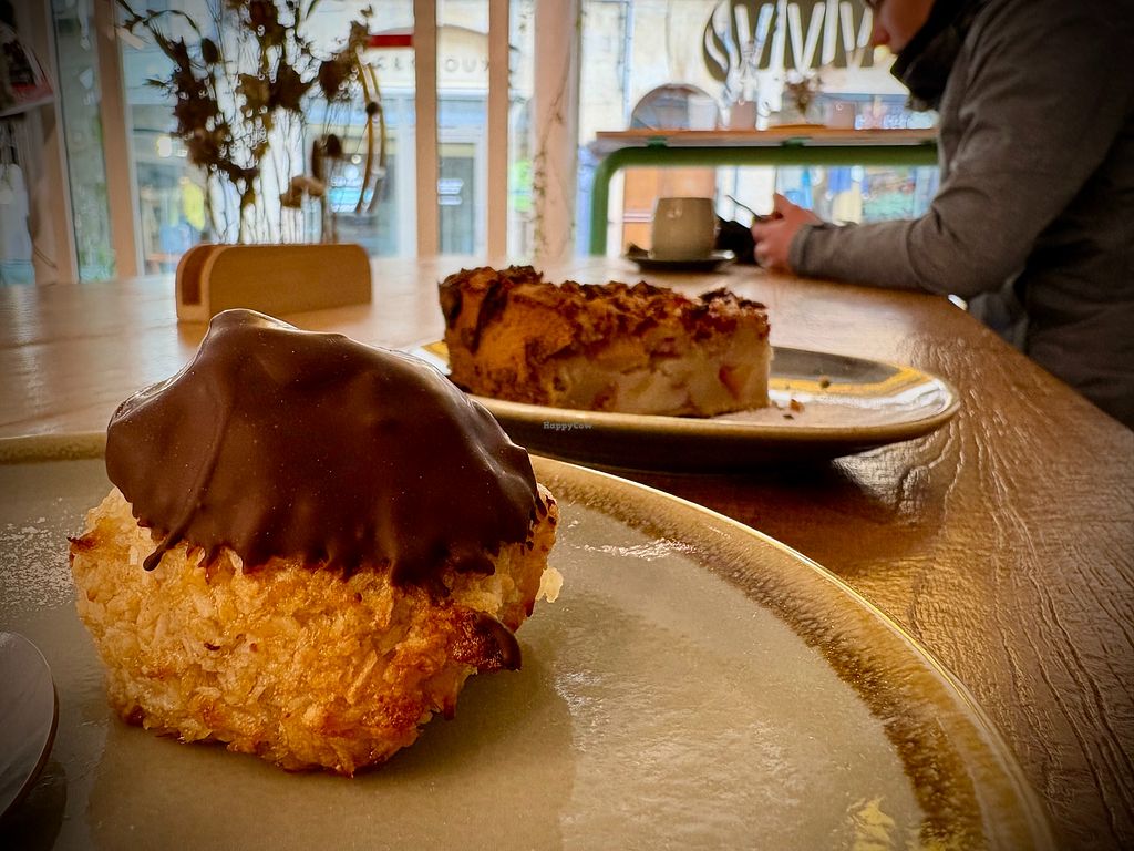 We had the "cheesecake" coco-citron and the gâteau banane pécan vanille. Also a cappuccino with oat milk and an ice tea. It was all very tasty, but it cost a bit too much (we spent 19€)