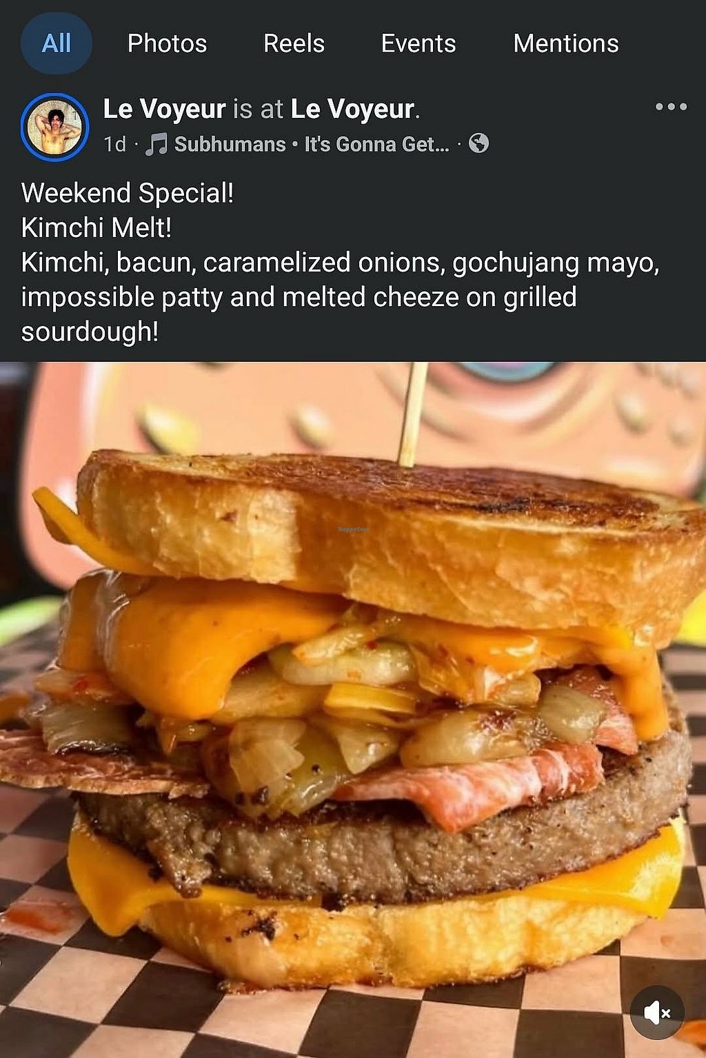 Read moreI was super excited to try their weekend special, Kimchi Melt, consisting of Kimchi, bacun, caramelized onions, gochujang mayo, impossible patty and melted cheez on grilled sourdough. The sammich was a beautiful mess and a fork was a definite necessity to devour everything that dropped down to the plate. Admittedly, my picture did not begin to do this sammich justice so I'm including a picture of their FB post as well. I'm not sure what type of bacun they used for their sammiches but it was amazing, great flavor and texture, really adds a lot to the meal.