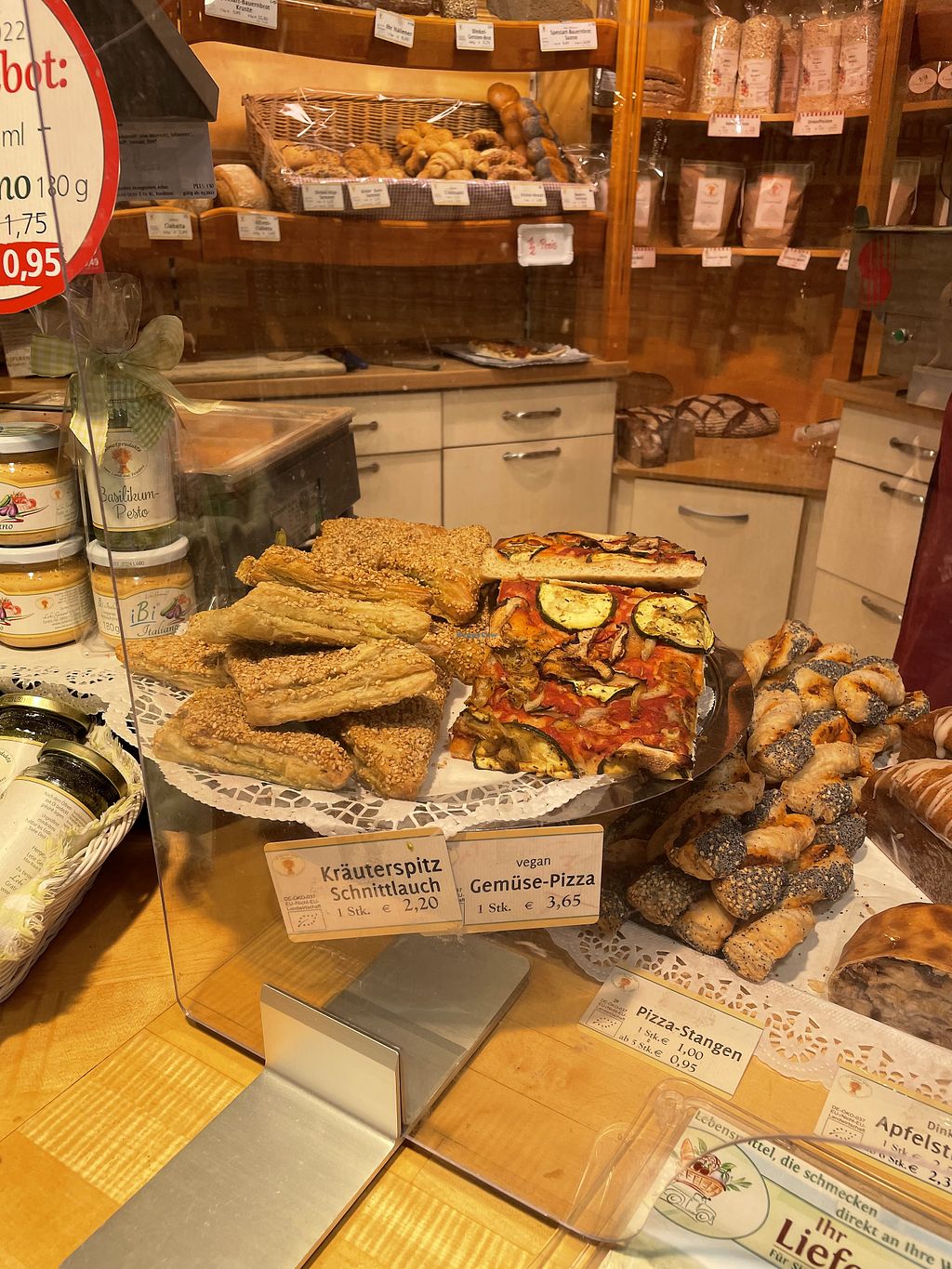 So this is my first time in Germany and as a vegan I knew I wouldn't get to try the traditional fare. Dips seem popular and this place has a lot. They have bread and cookies. Even Lebenkuchen cookies. I tried the onion dip with bread. Very good. I also had an apple streudel. Very good! They also had vegan salad dressing I will probably get.