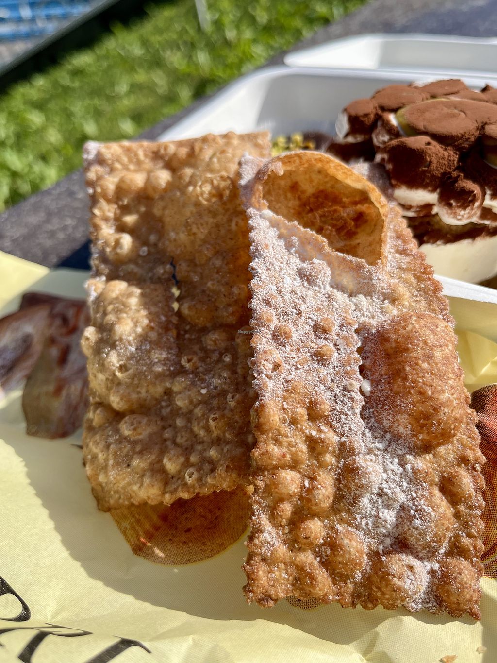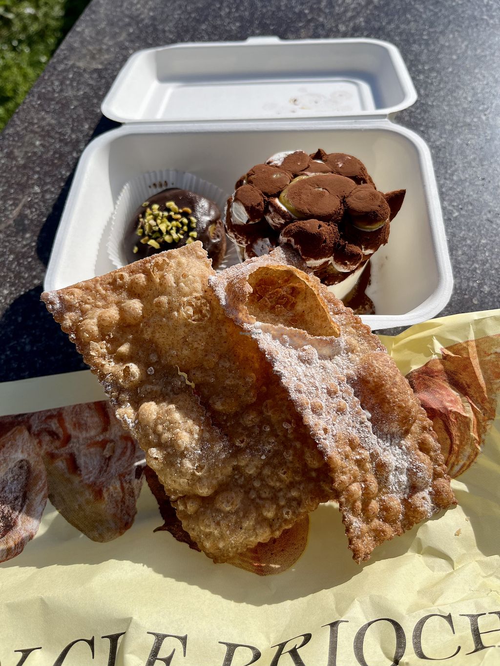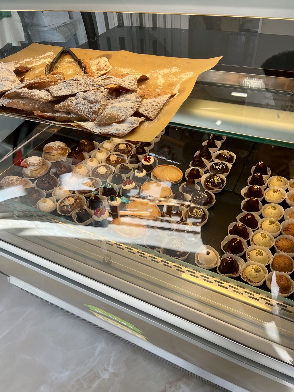 This is a complete vegan pastry. They have a good selection of small and normal dimensions. For me everything was tasty. It is a take away mainly and they don't have coffee. Since it is Easter I also bought a "colomba " typical sweet from this period. I paid 48 euro. I don't know the details price but I found a bit for 3 small pastries and 1 colomba. The owner told me that cannoli was a present and he also made me taste the colomba.