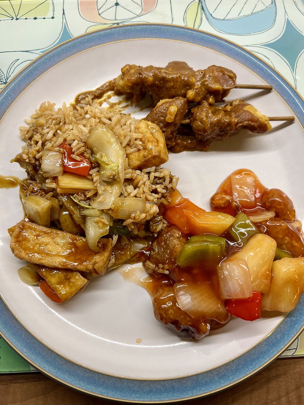Mix of sweet and sour, satay skewers and special fried rice
