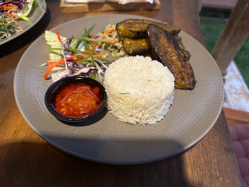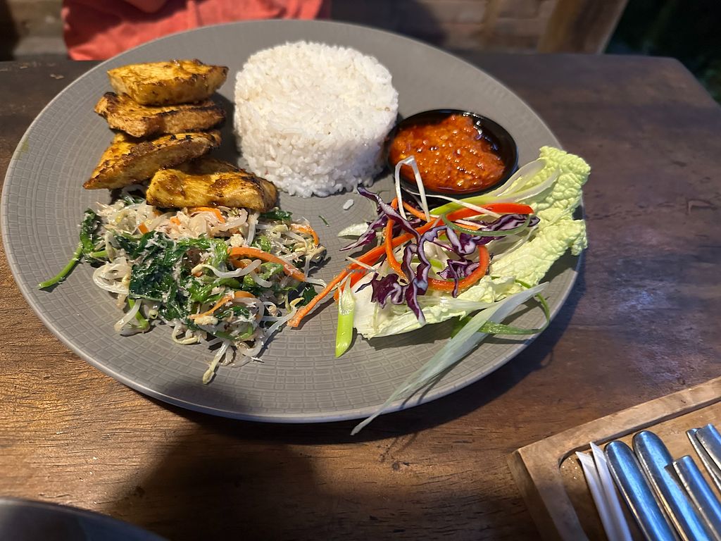 We received a warm, friendly greeting at this family-run restaurant serving fresh Balinese food. We sat in the beautiful, secluded garden out the back. The grilled eggplant with Balinese seasoning (terong bakar bumbu Bali) was delicious and came with Balinese vegetables (sayur urab) and steamed rice. We also ordered the grilled tofu served with sayur urab and steamed rice – very tasty and fresh. The hot chilli sauce is served in a separate bowl. The fruit punch (orange, pineapple and mango juice with grenadine syrup) was very refreshing. Highly recommended dining experience!