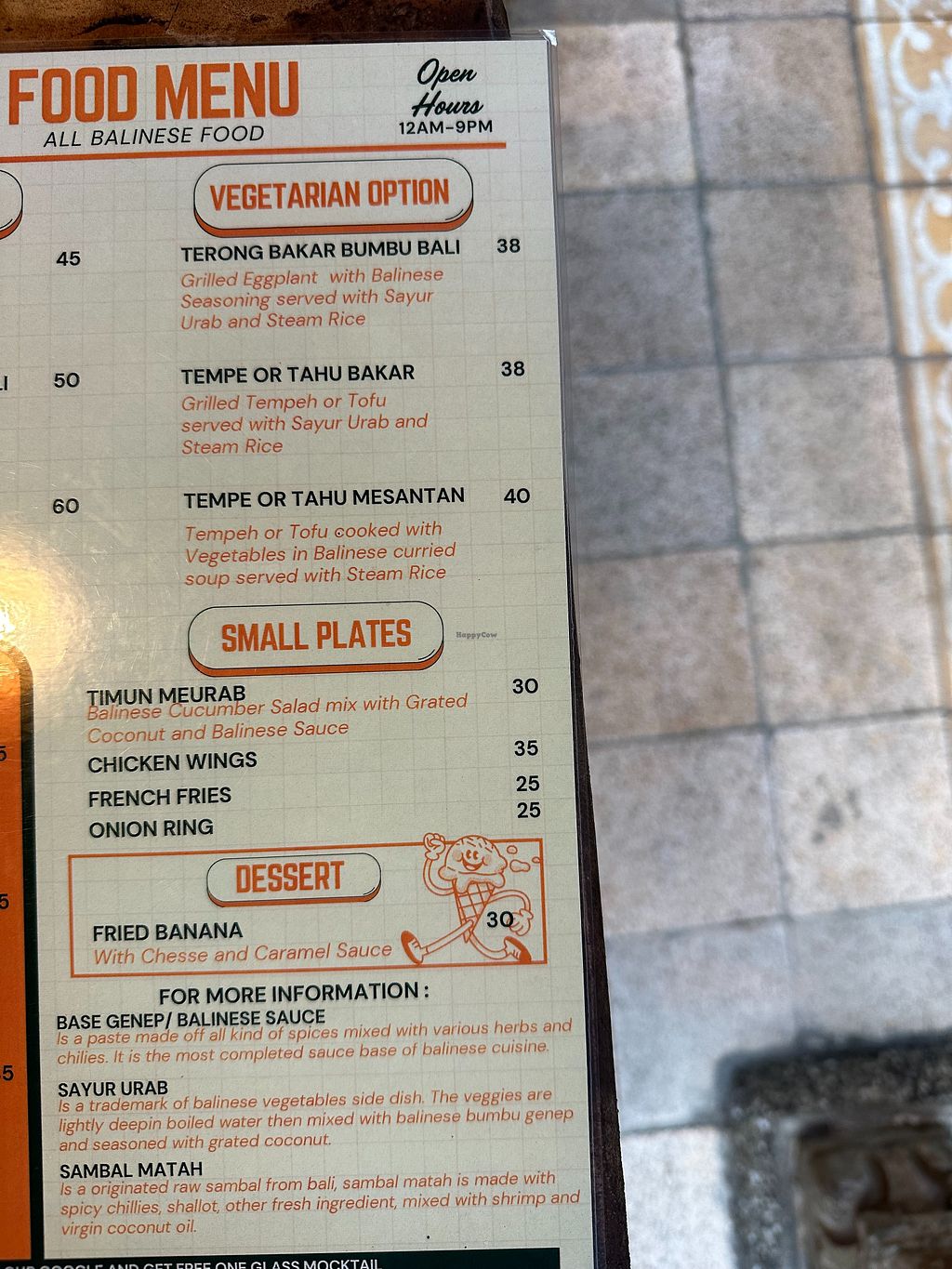 Serves meat, vegan options available. Balinese home cooking with vegan mains such as grilled eggplant with Balinese seasoning and vegetables, grilled tempeh or tofu with Balinese vegetables (sayur urab), and tempeh or tofu cooked with vegetables in Balinese curried soup. Vegan starters include Balinese cucumber salad, french fries, and onion rings. Open Mon-Thu 12:00pm-9:00pm, Fri 12:00pm-9:00am, Sat-Sun 12:00pm-9:00pm. Closed Thu.