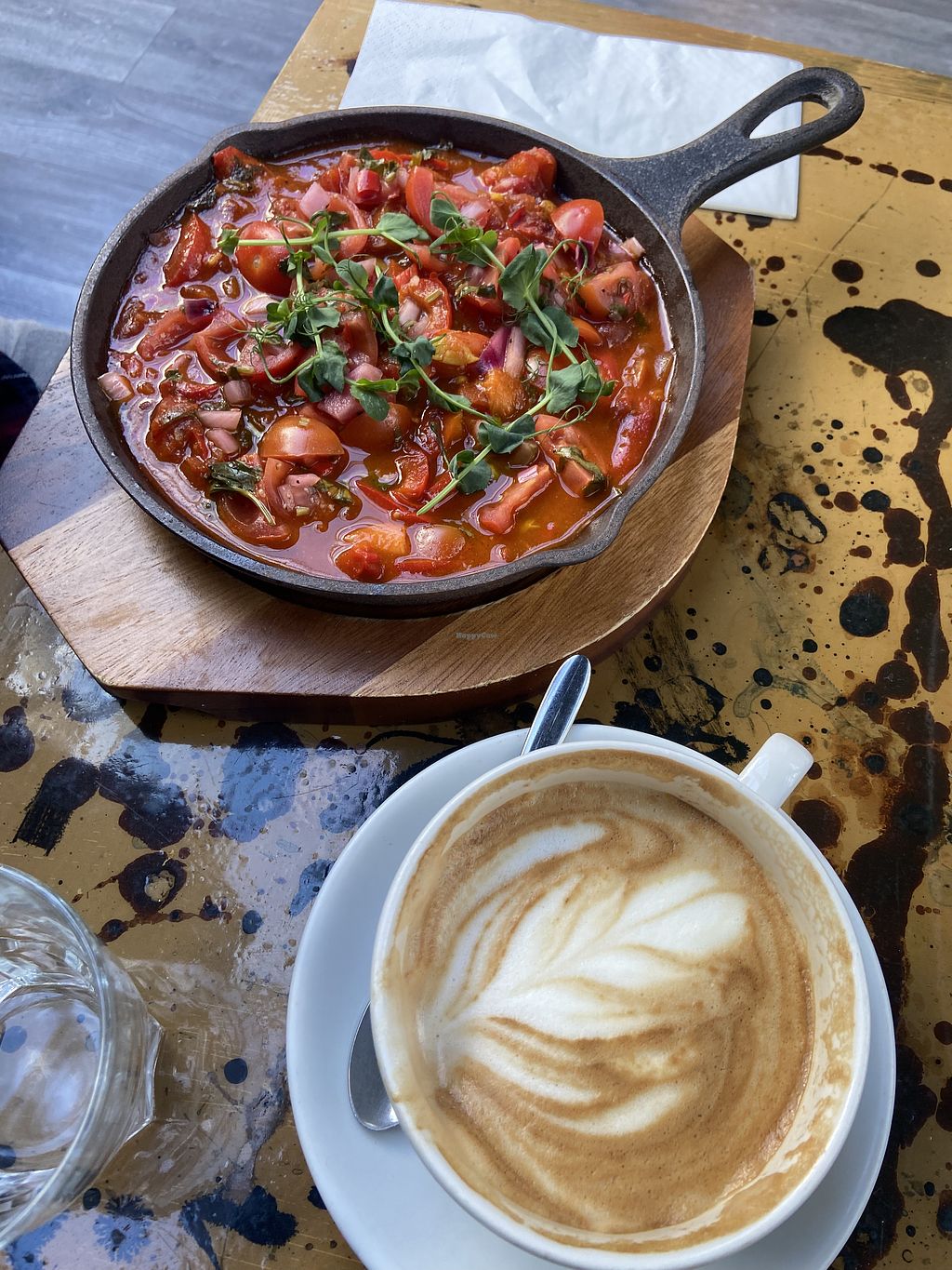 Yummy coffee and a few breakfast items that can be made vegan (toast and shakshuka)