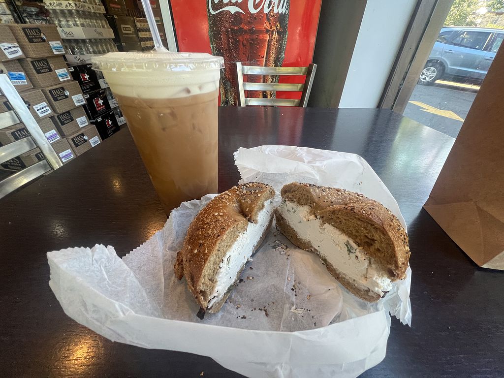 I was very happy with my bagel and iced coffee from here, plus they have 3 different vegan cream cheeses and they slather it on there.