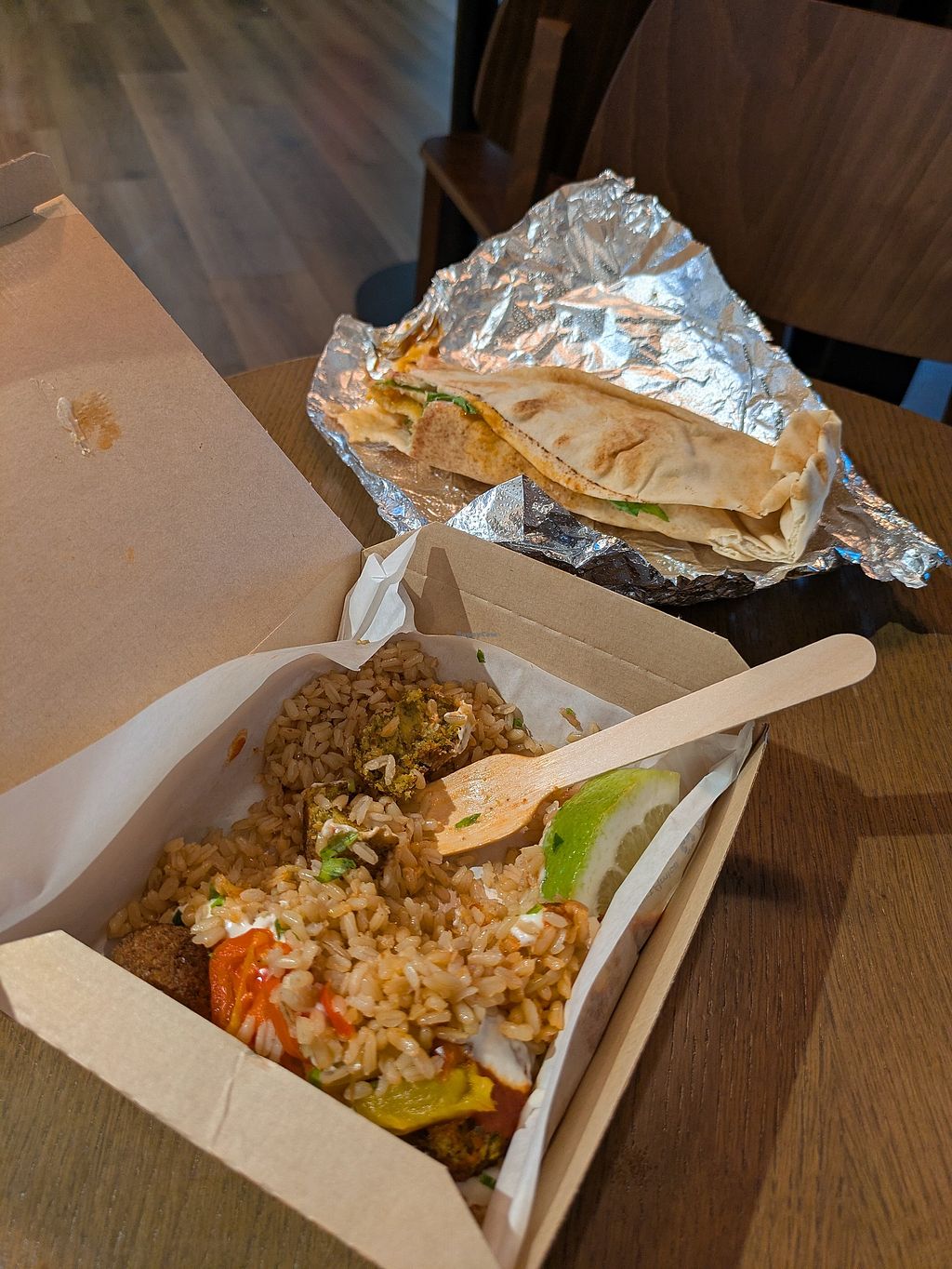Serves meat, vegan options available. Chain eatery self-billed as "naturally fast food." Offers a menu of sandwiches, smoothies, wraps, baked fries, rice and salad boxes. Has plant milk for coffee & drinks. Website shows which items are vegan. Summer 2019 added vegan menu with a burger and faux chicken wings. Serves meat, vegan options available. Restaurant with a menu inspired by the Mediterranean cooking, with plenty of whole grains, plant variety, nuts, and seeds., They offer vegan burger, hummus, vegan slaw, falafel wrap, falafel rice box, falafel bowl, and vegan desserts. They also offer hot drinks such as espresso with oat milk.