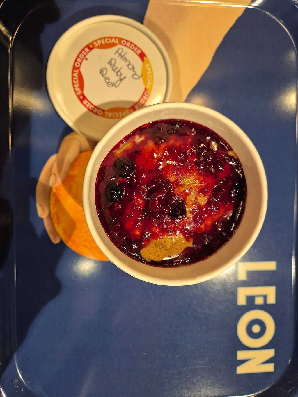Ruby almond porridge with "activated" almond milk and soya latte