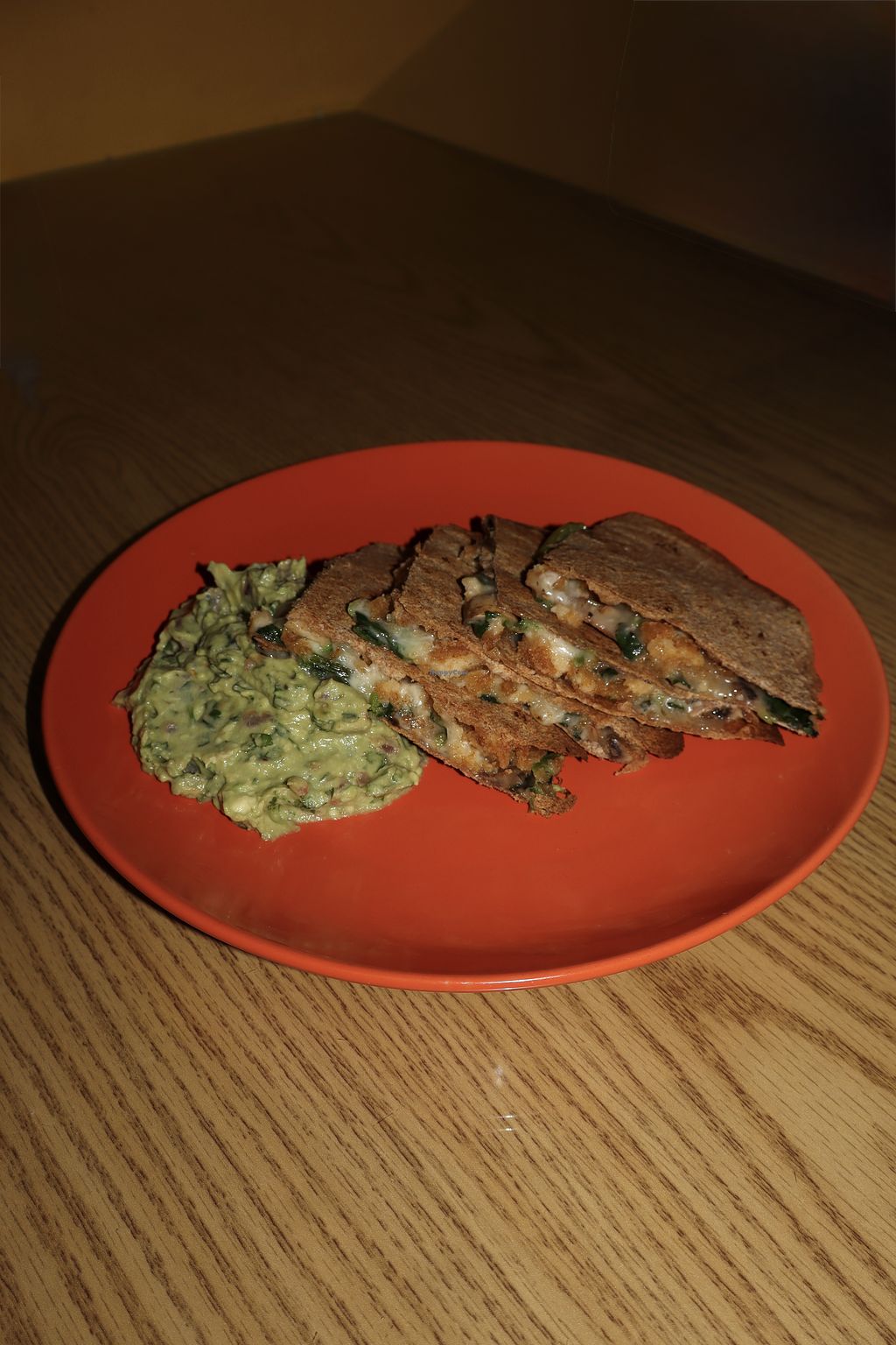 Please try the works quesadilla , vegan cheese, vegan "chicken", and spinach, in a whole wheat tortilla. 😜
