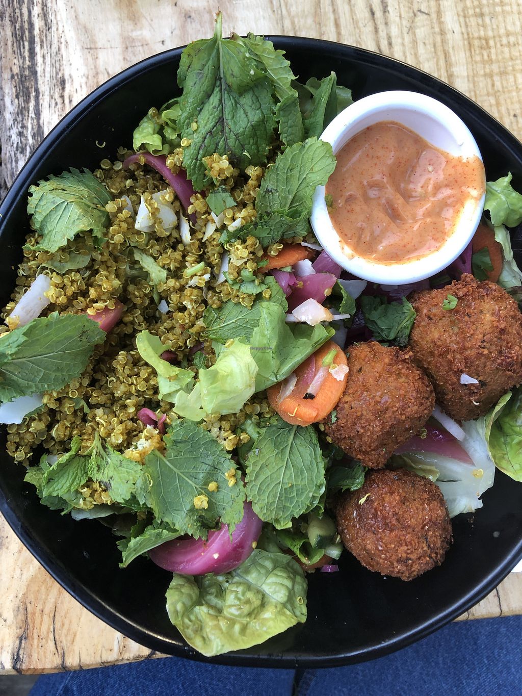 Lacto Ovo Beer/Wine European French Non-veg Serves meat, vegan options available. Bar and bistro serving a menu of local dishes. Vegan options include a falafel salad and roasted vegetables. Open Wed-Sun 10:00-01:00. Closed Mon-Tue. More