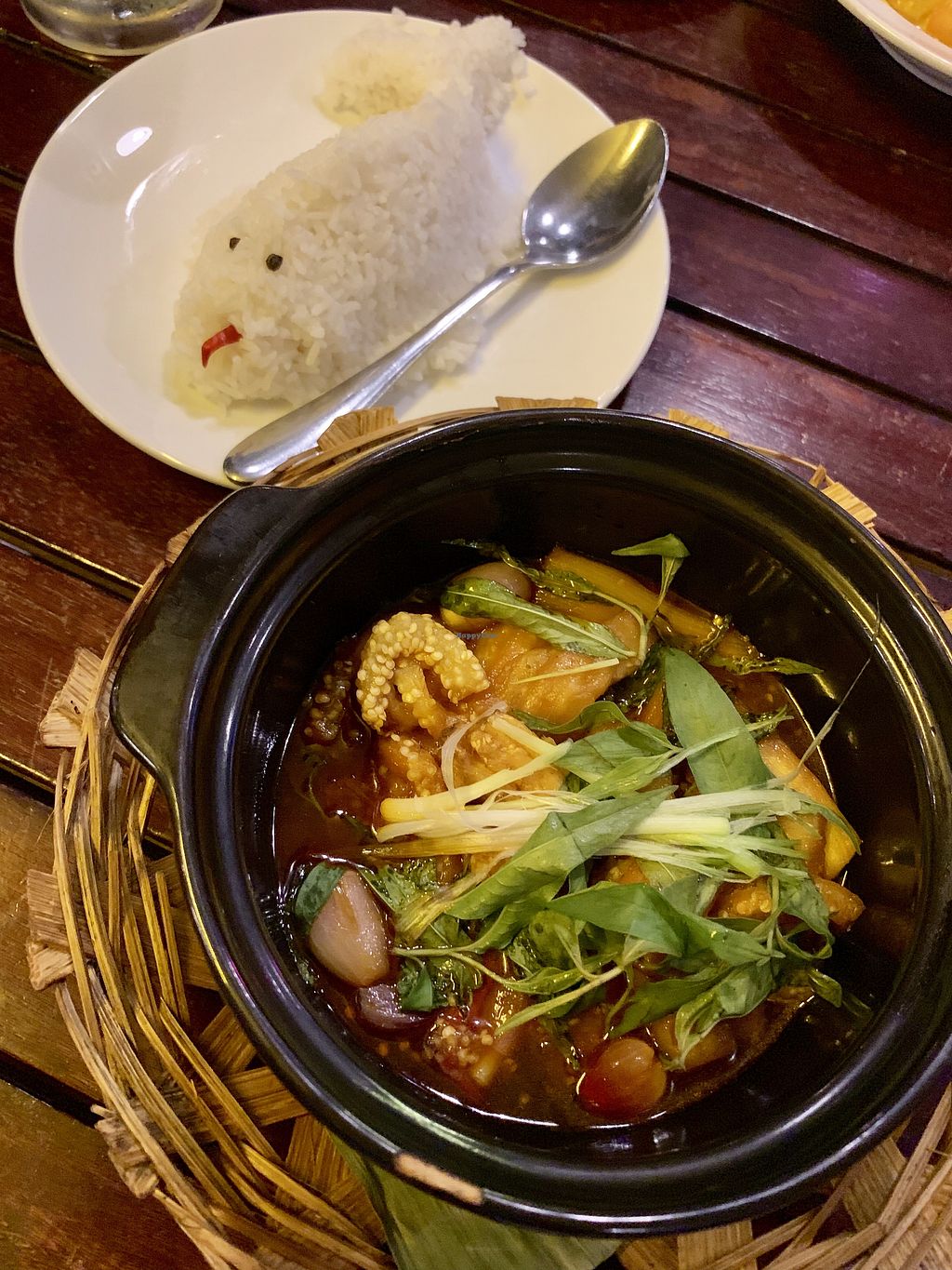 Veg curry, not too hot, in creamy coconut sauce. Cute rice, lol