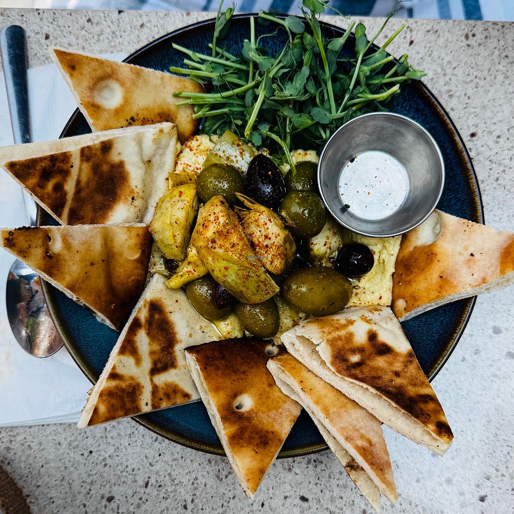 Hummus Olives marinées chaudes, artichaut, zeste d'orange, naan