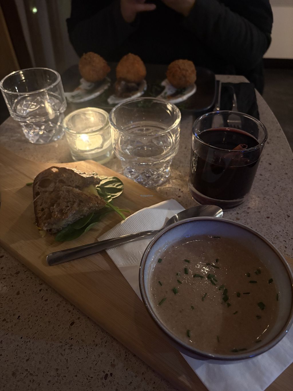 Arancini (back) and onion soup