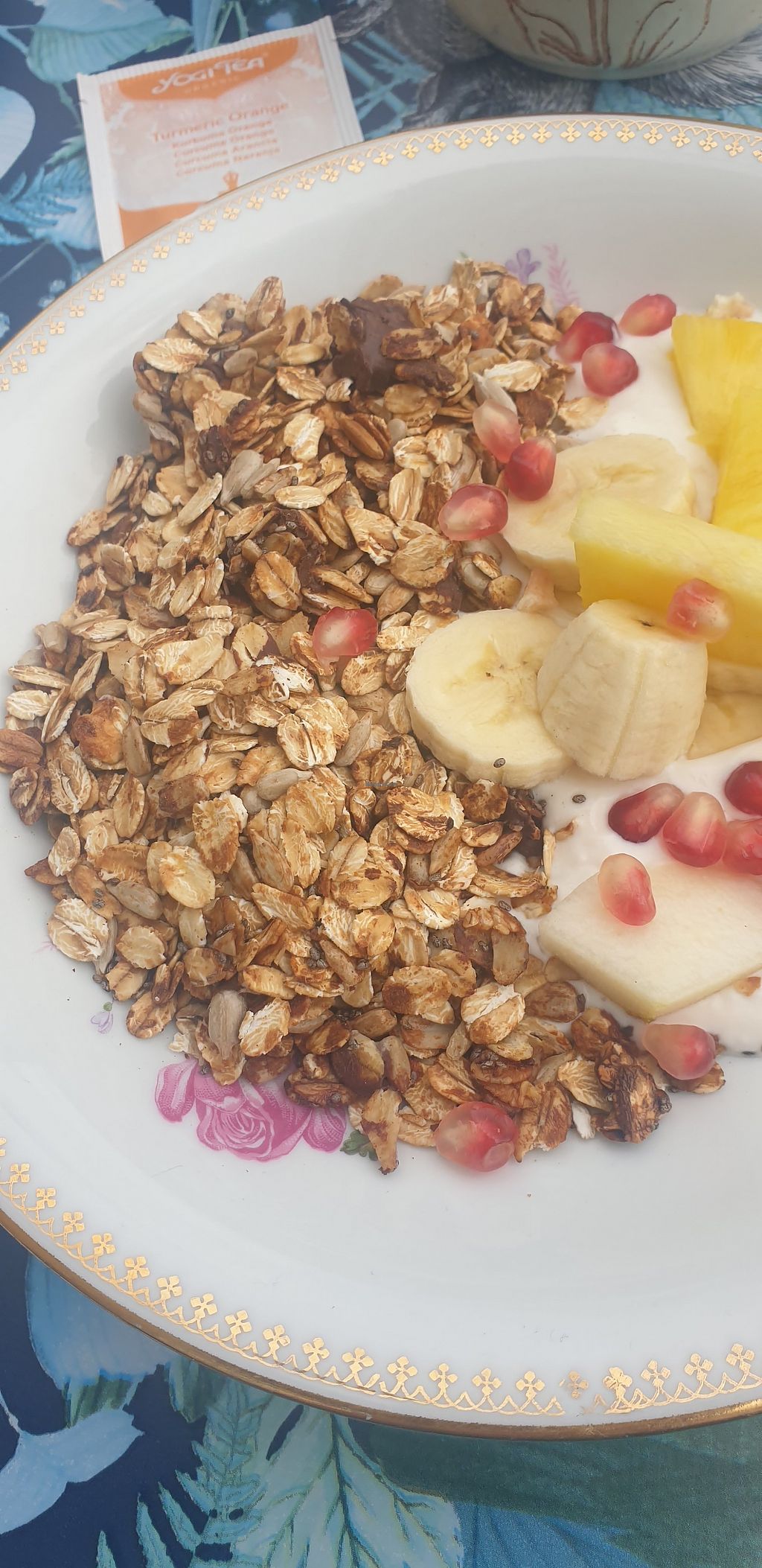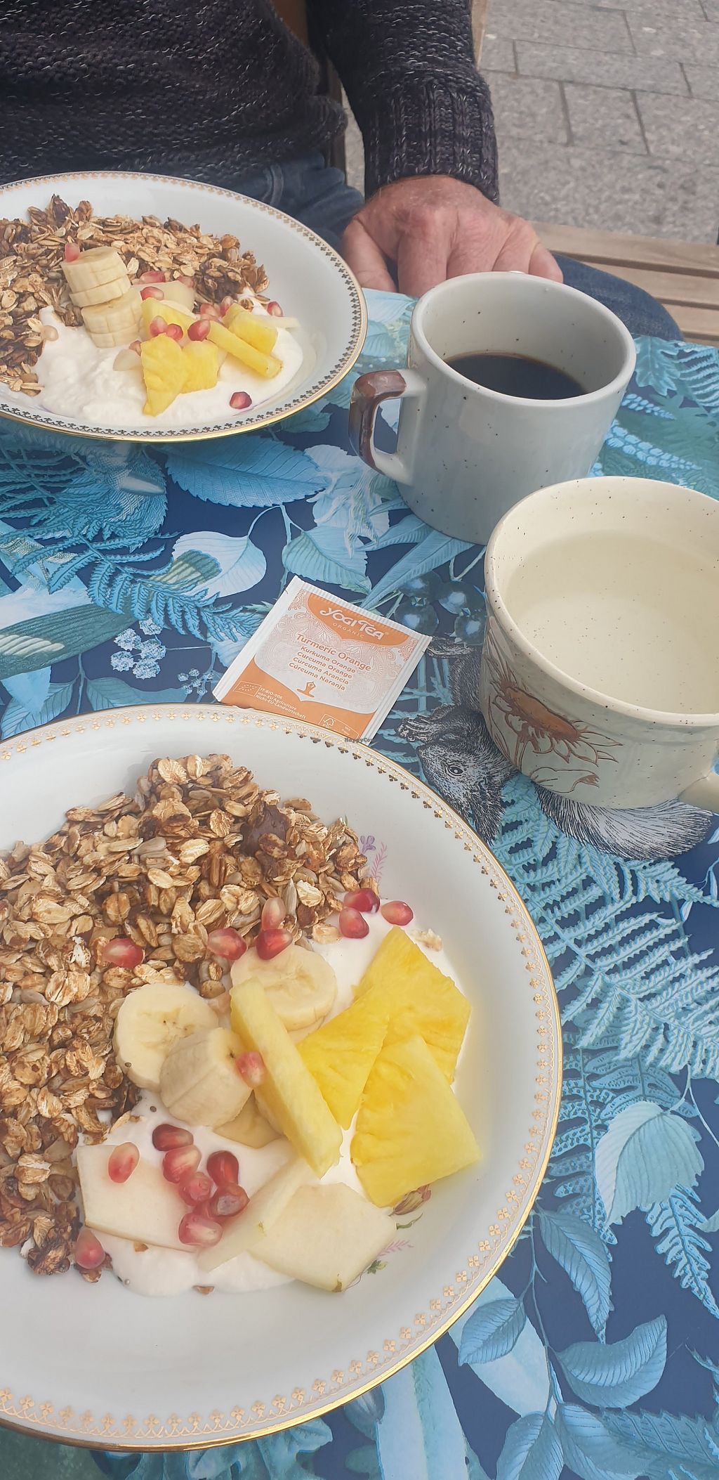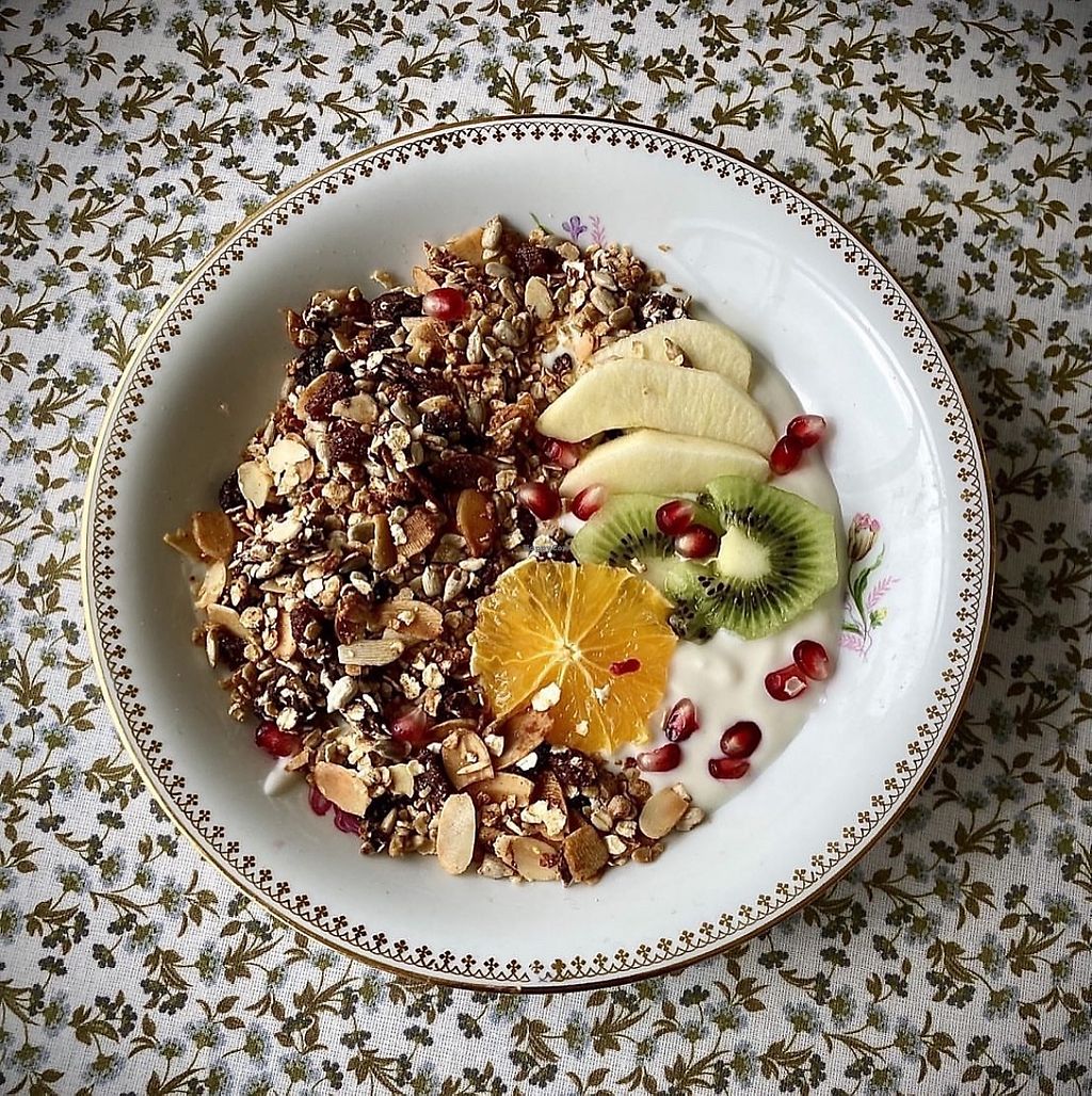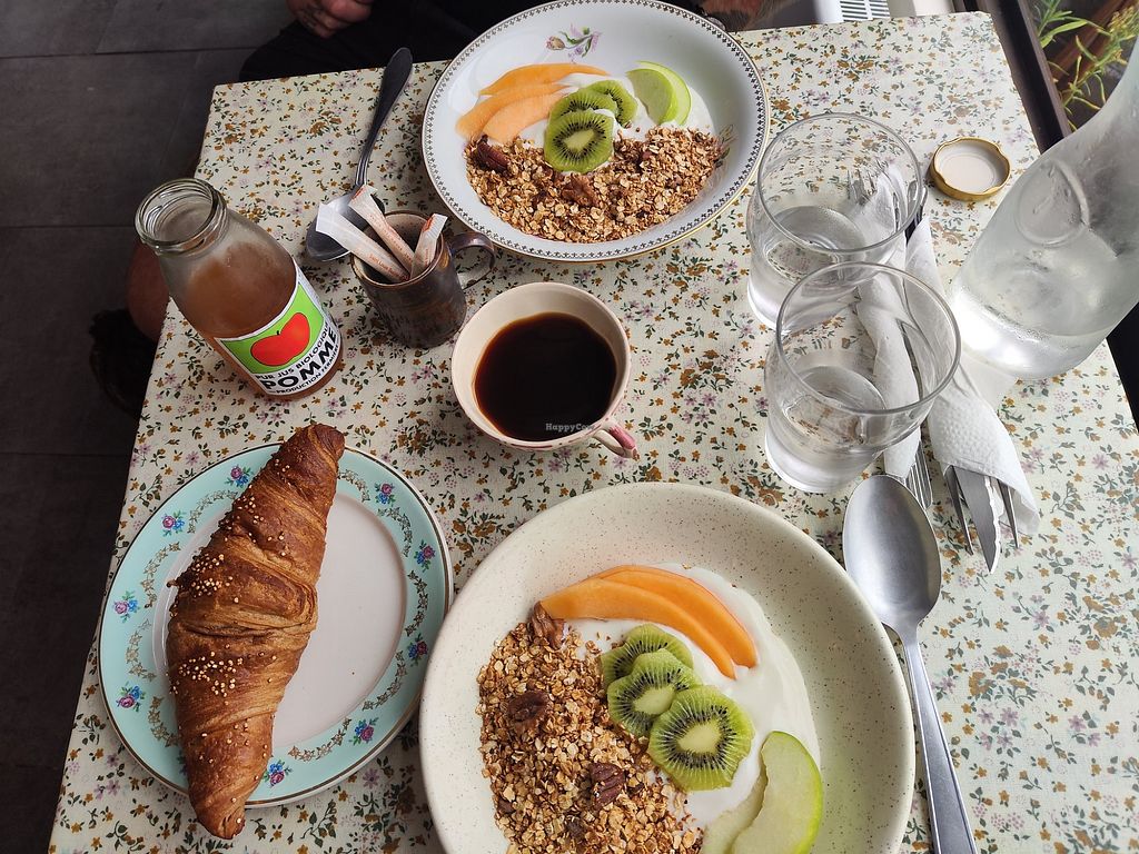 Granola, fresh fruit, croissant, coffee and apple juice