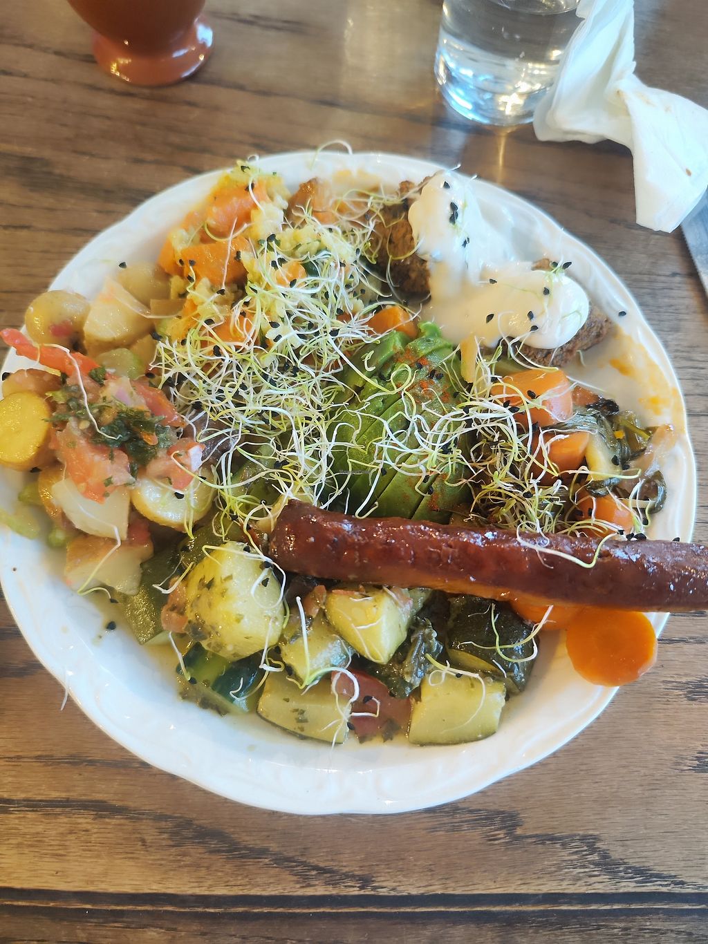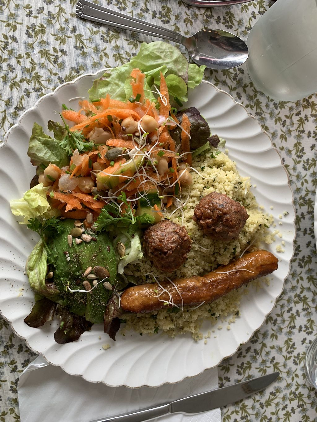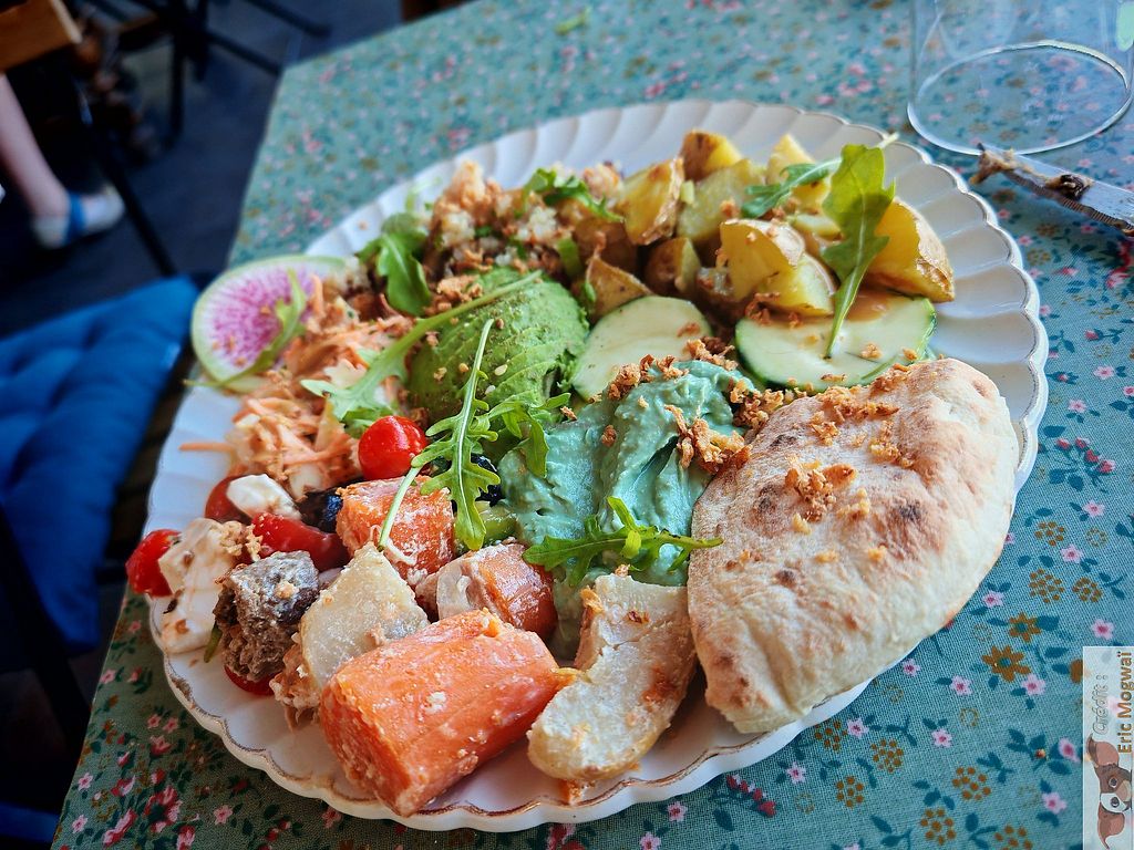 A plate of cream of chickpea soup, spirulina cosclaw, potato salad, tr…