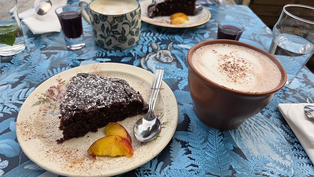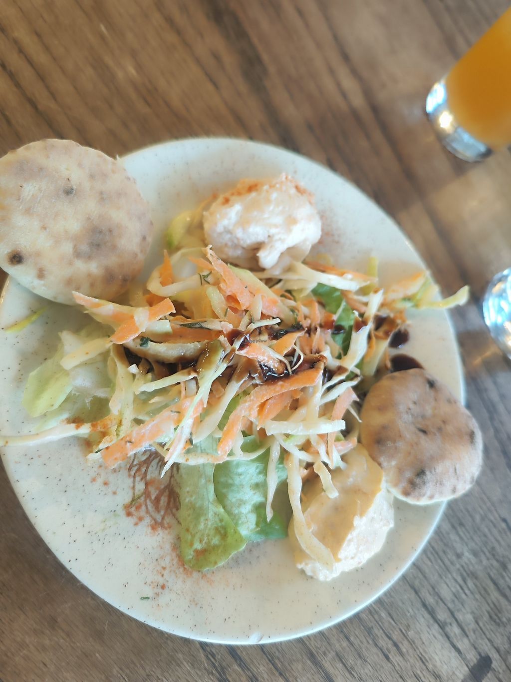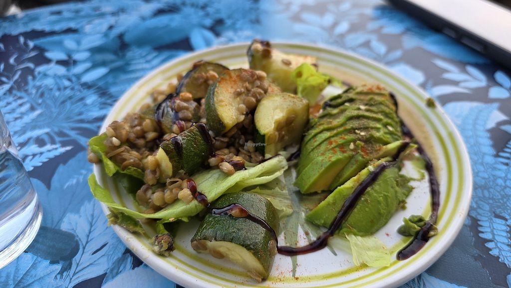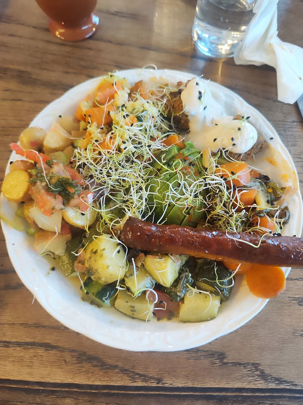 A plate of cream of chickpea soup, spirulina cosclaw, potato salad, tr…