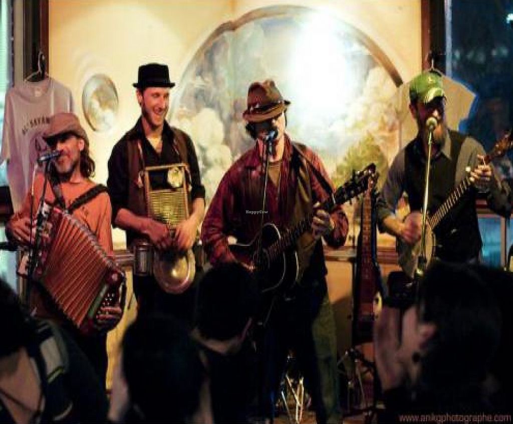 Montreal veggie cafe attached to a hostel; previously name L'Utopik. Features a special each day. Approximately 1/3 of the menu is vegan or can be made vegan. Uses mostly organic ingredients. Live shows every night starting at 6pm. Reported closed October 2020.