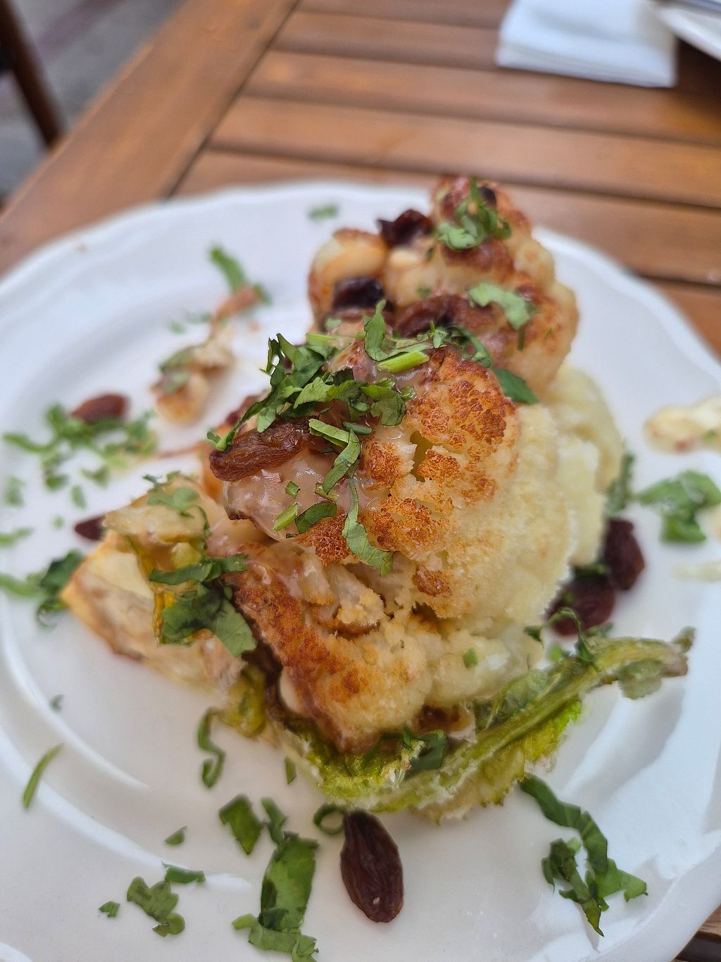 Great tapas place located on a quiet location, outside and inside seating, the staff is really nice. Several vegan options marked clearly on the menu, I had the fried cauliflower head, sourdough bread and kale Caesar salad, really nice ! Portion sizes are rather conservative but the food is lovely. Can’t wait to be back !