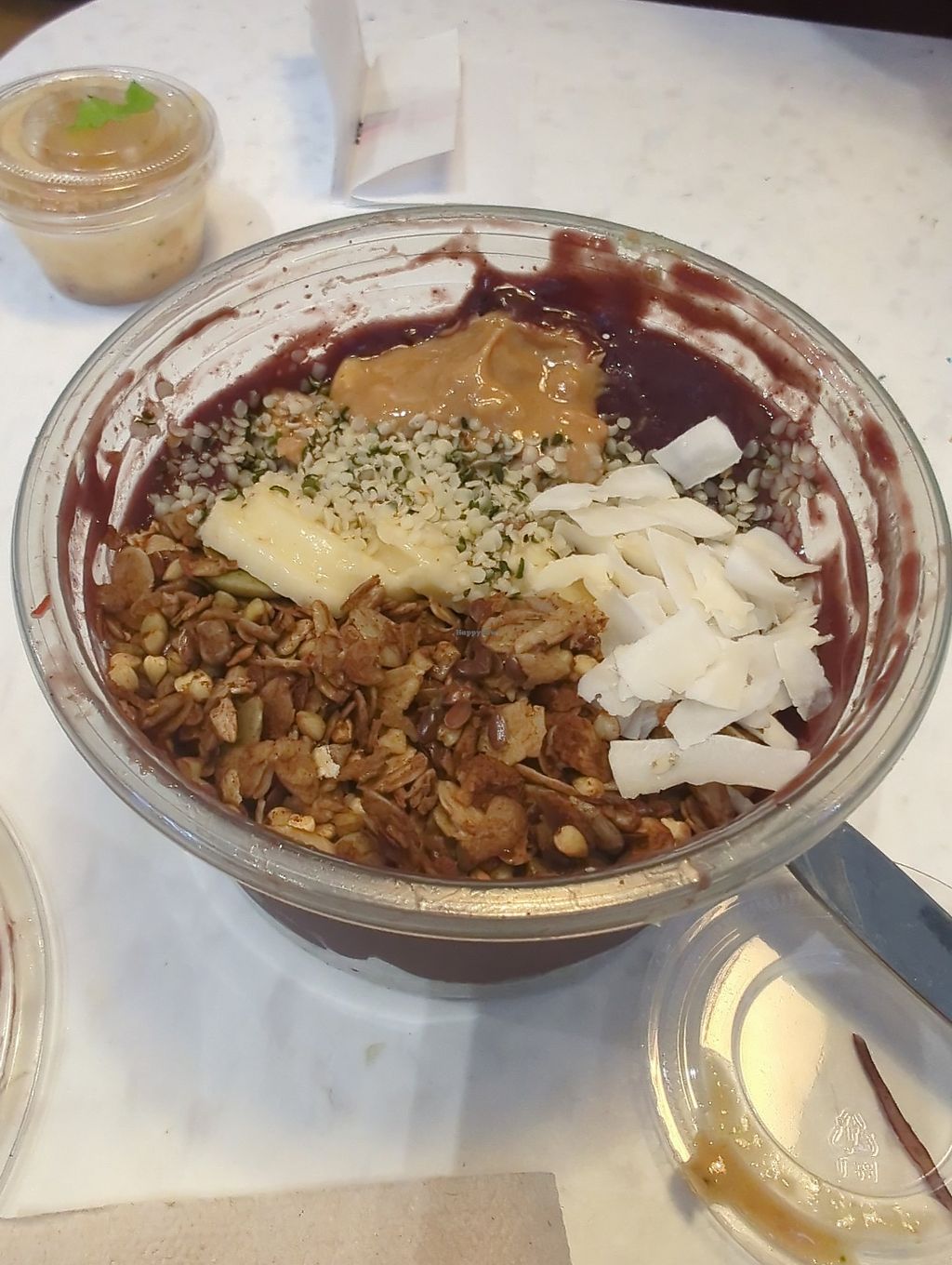 Got a vegan salad that had hummus and pesto vinaigrette. It was delicious, with lots of ingredients. Not the most convenient to eat on the plane though. A wrap probably would have been better.